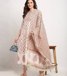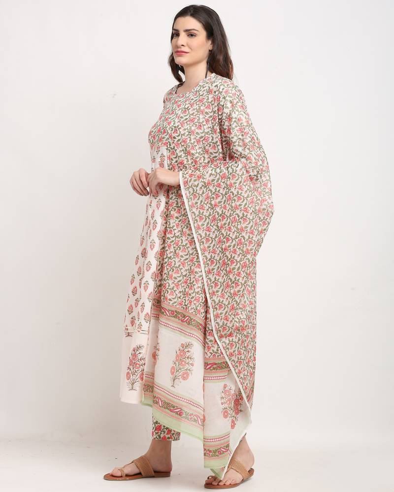 White & pink pure cambric cotton printed kurta & pant with dupatta stitched