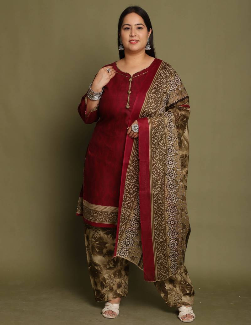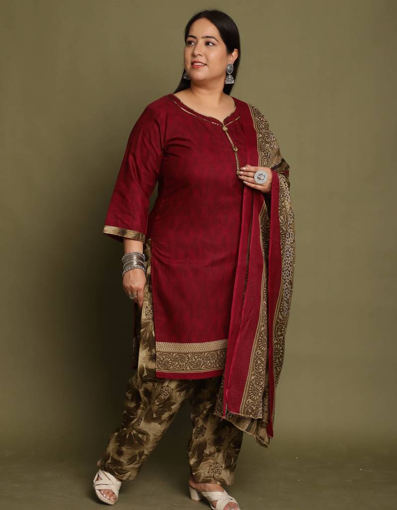 Wine cotton blend printed ready to wear patiala salwar suit stitched