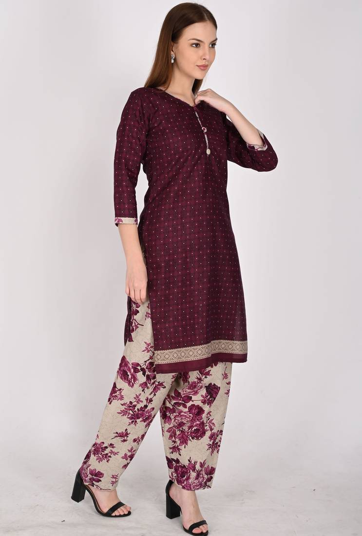 | Product Name | Wine Cotton Blend Printed Ready To Wear Patiala Salwar Suit | |