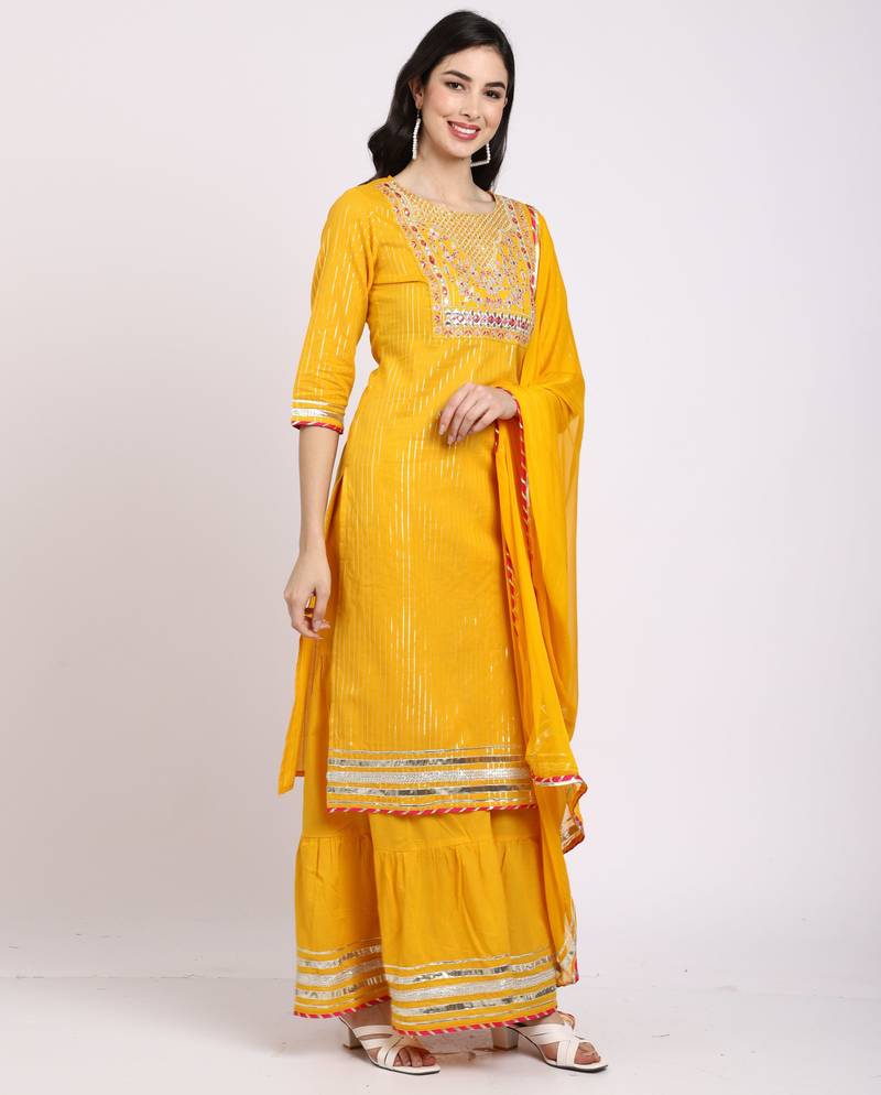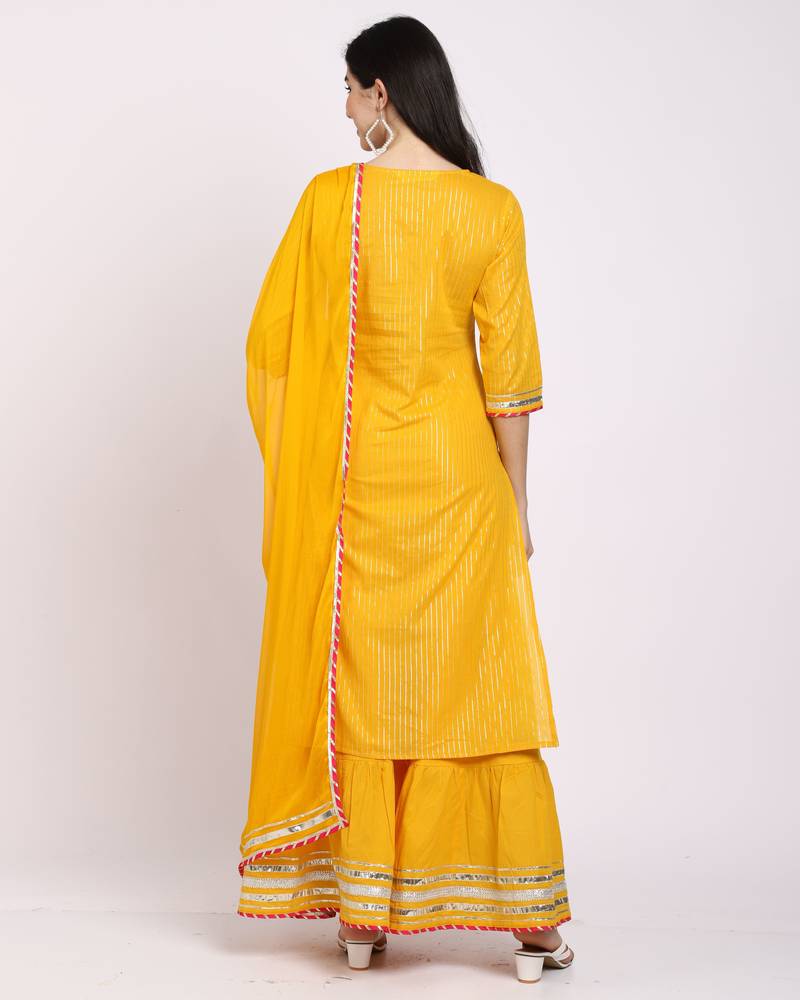 Yellow pure cotton lurex embroidered kurta & sharara with dupatta stitched