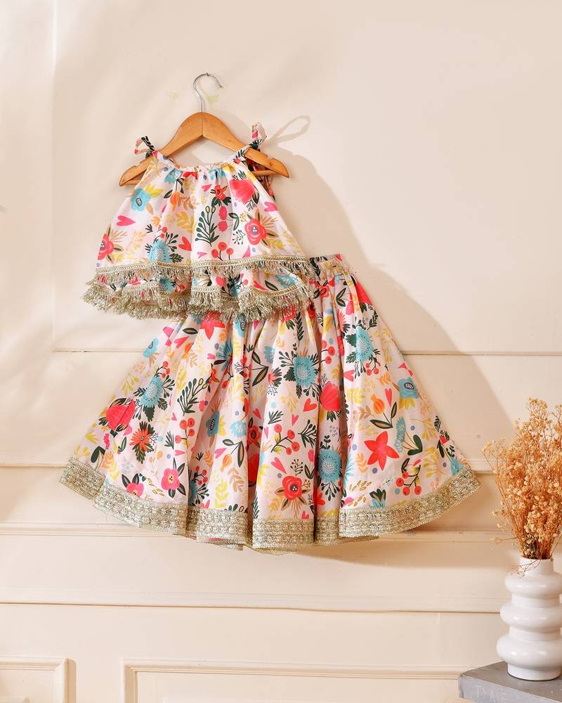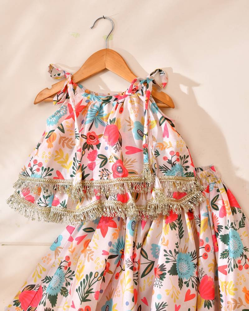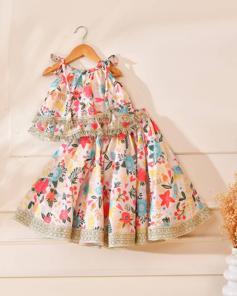 | Product Description | Bright, Playful, And Festive, This Kids Lehenga Set Is Designed To Make Little Girls Feel Special At Every Celebration. Crafted In A Soft Pastel Base With Vibrant Multicolour Floral Prints, The Set Brings Together Comfort And Charm In Equal Measure. The Sleeveless Crop Style Top Features Delicate Shoulder Tie Ups And Layered Frills, Beautifully Highlighted With Shimmering Lace Tassel Detailing Along The Hem. The Matching Flared Lehenga Skirt Is Finished With A Rich Gold Lace Border That Adds A Traditional Touch While Allowing Easy Movement For All Day Comfort. Lightweight, Breathable, And Skin Friendly, This Set Is Ideal For Festive Occasions, Family Functions, Weddings, And Special Celebrations. Key Features: Two Piece Set: Frill Top With Lehenga Skirt Soft Pastel Fabric With Colourful Floral Print Shoulder Tie Up Detailing For A Cute, Adjustable Fit Elegant Gold Lace And Tassel Trims Comfortable, Lightweight, And Festive Ready Perfect For Festivals, Birthdays, Weddings, And Ethnic Occasions. |