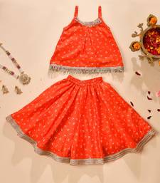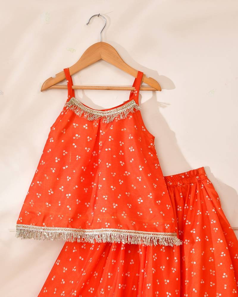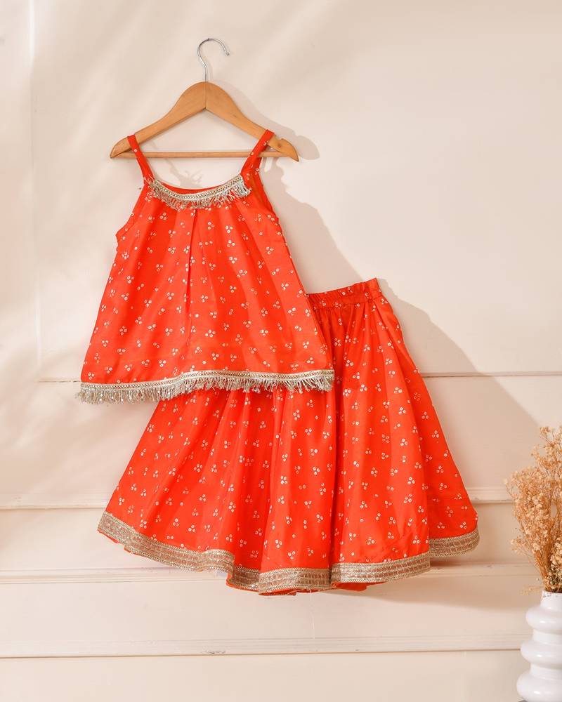 | Product Description | A Vibrant Orange Kids Lehenga Set Featuring A Sleeveless Flared Top With Delicate Silver Fringe Detailing At The Neckline And Hem. Paired With A Matching Elasticated Lehenga Skirt, Highlighted By A Subtle Gold Silver Lace Border. Crafted In Soft, Lightweight Fabric With Traditional Dotted Print, This Set Offers Comfort, Elegance, And Easy Movement—Perfect For Festive Occasions, Weddings, And Celebrations. |