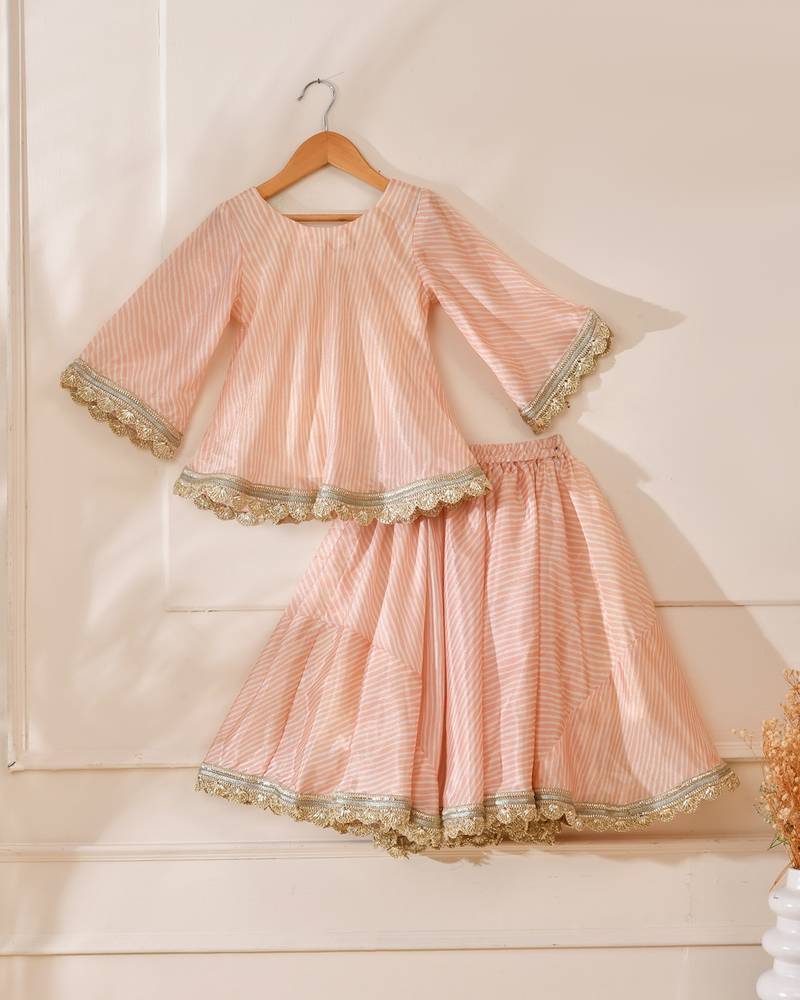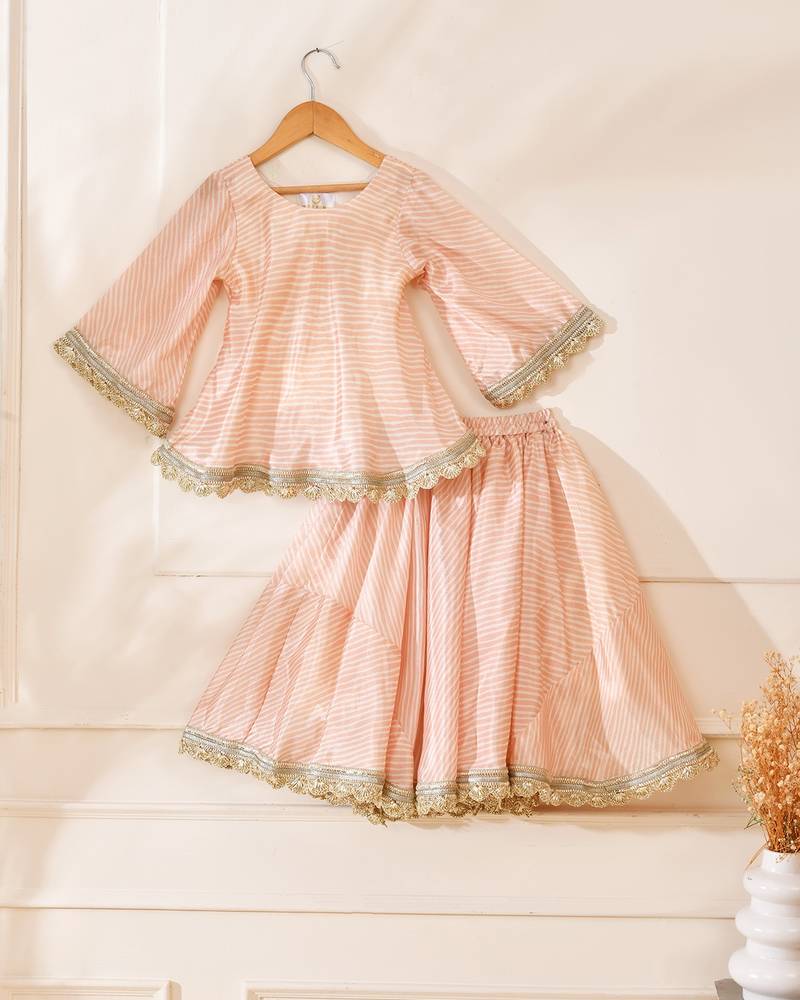 A Charming Festive Lehenga Set For Your Little One, Crafted In Soft, Breathable Fabric For All Day Comfort. Featuring A Flared Peach Lehenga With Delicate Gold Lace Detailing And A Matching Peplum Style Top, This Set Is Perfect For Weddings, Festivals, And Special Celebrations.