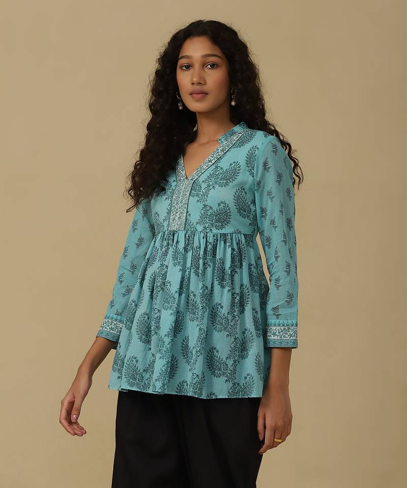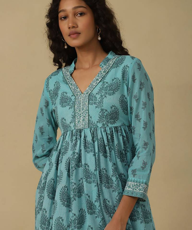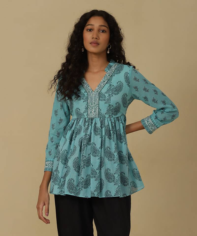 | Product Description | Featuring Aqua Paisley Print Kurti With Camisole. |