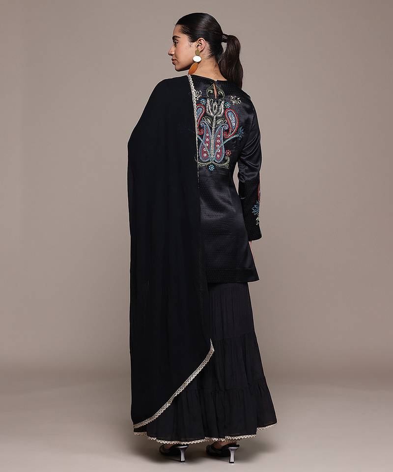 This Black Embroidered Silk Sharara Set Exudes Luxury With Its Rich Texture And Intricate Detailing. The Flared Sharara Adds Elegance And Movement, Making It Perfect For Festive Occasions. A Sophisticated Ensemble That Blends Traditional Charm With A Bold And Timeless Appeal.