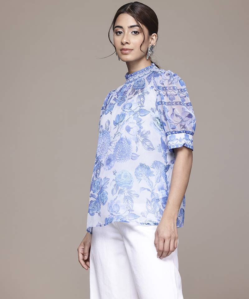 Blue chiffon top with printed work design
