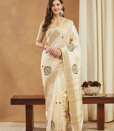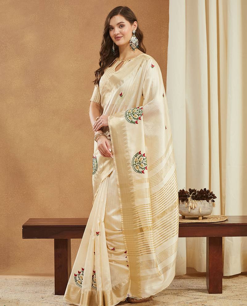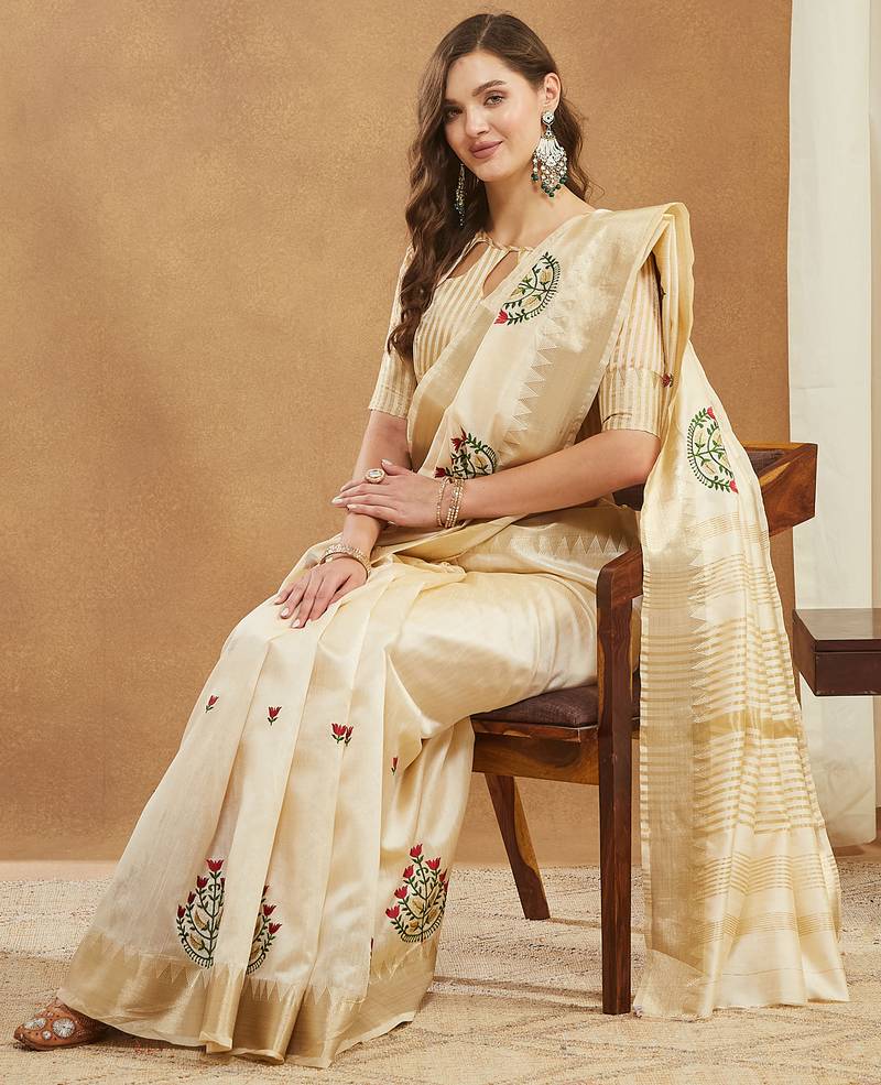 Cream assam cotton art silk saree with embroidery with emple border