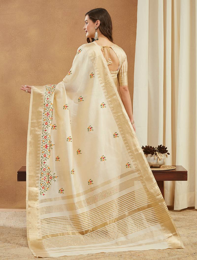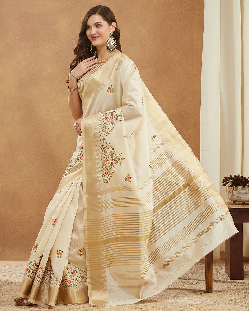 White assam cotton art silk with golden border and multicolor thread embroidered saree