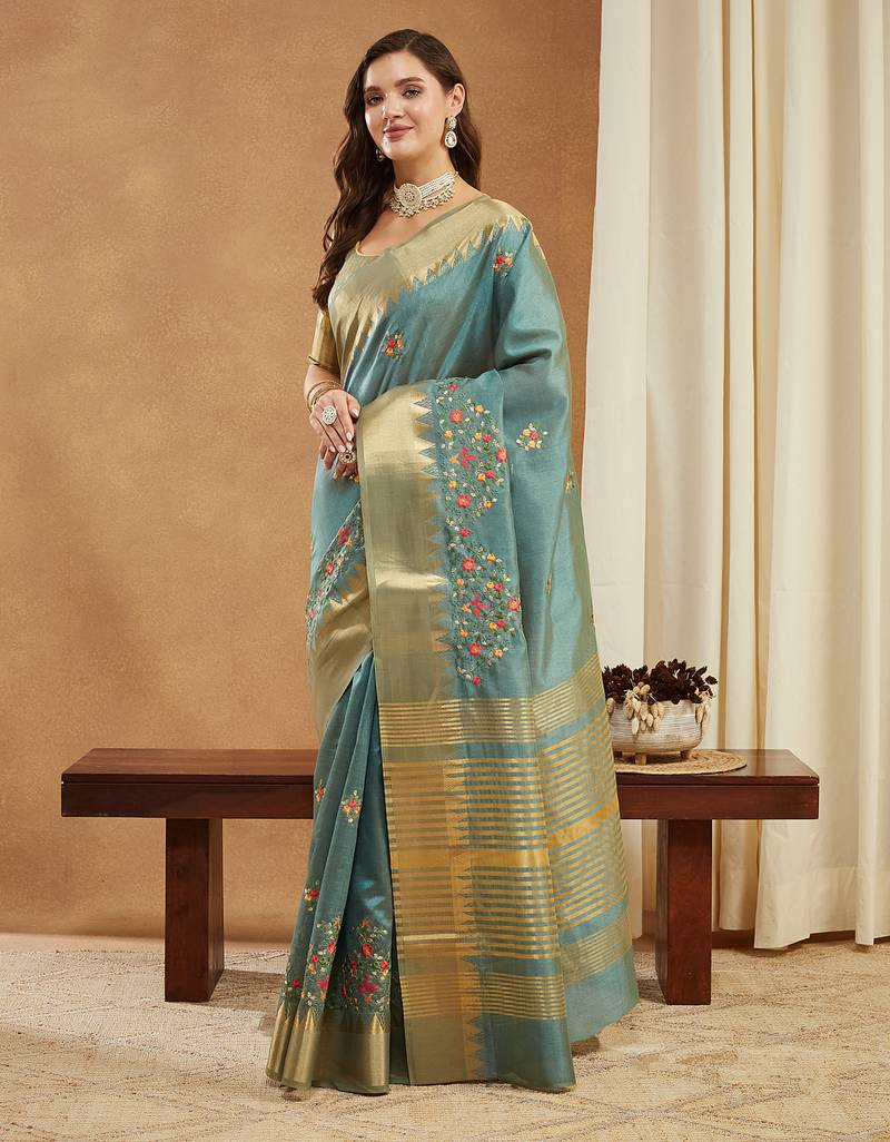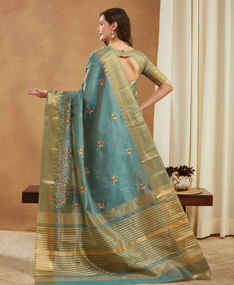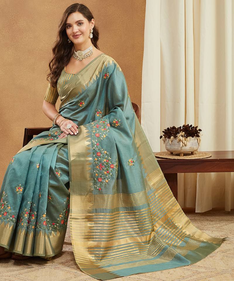 Turquoise assam cotton art silk with golden border and multicolor thread embroidered saree