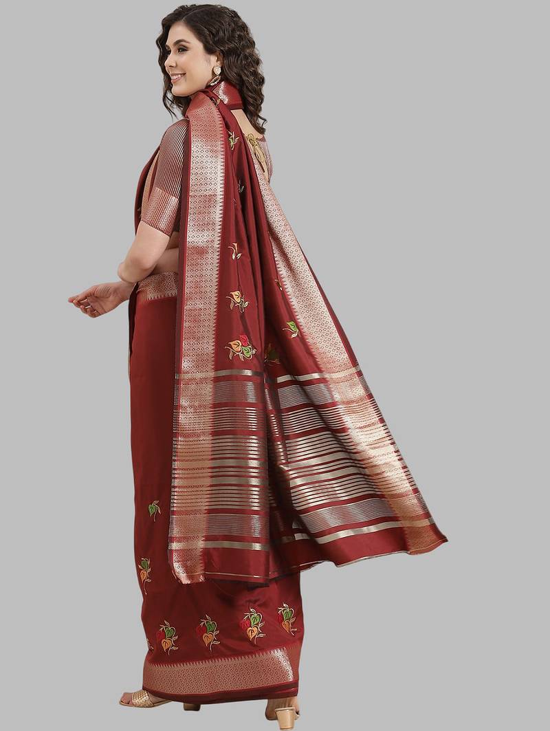 Product Name Dark Maroon Soft Cotton Silk With Colourful Thread Embroidery Saree With Blouse