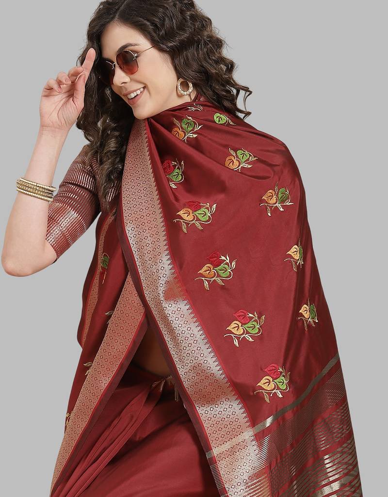 DarkMaroon soft cotton silk with colourful thread embroidery saree with blouse