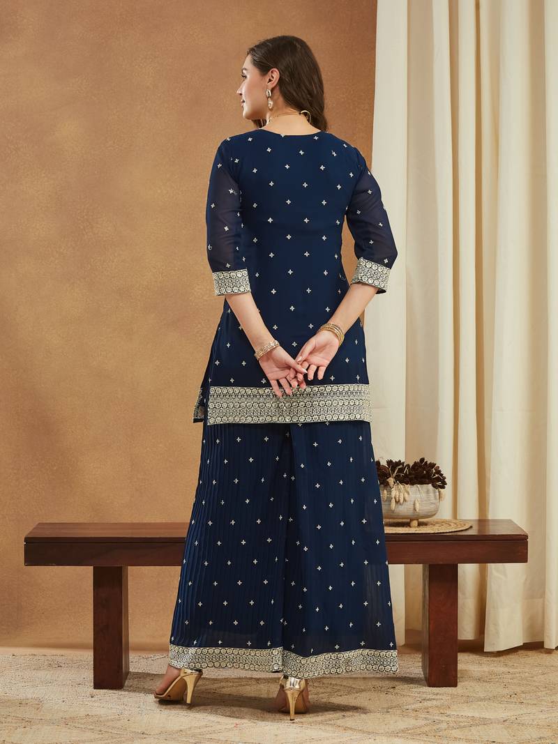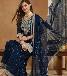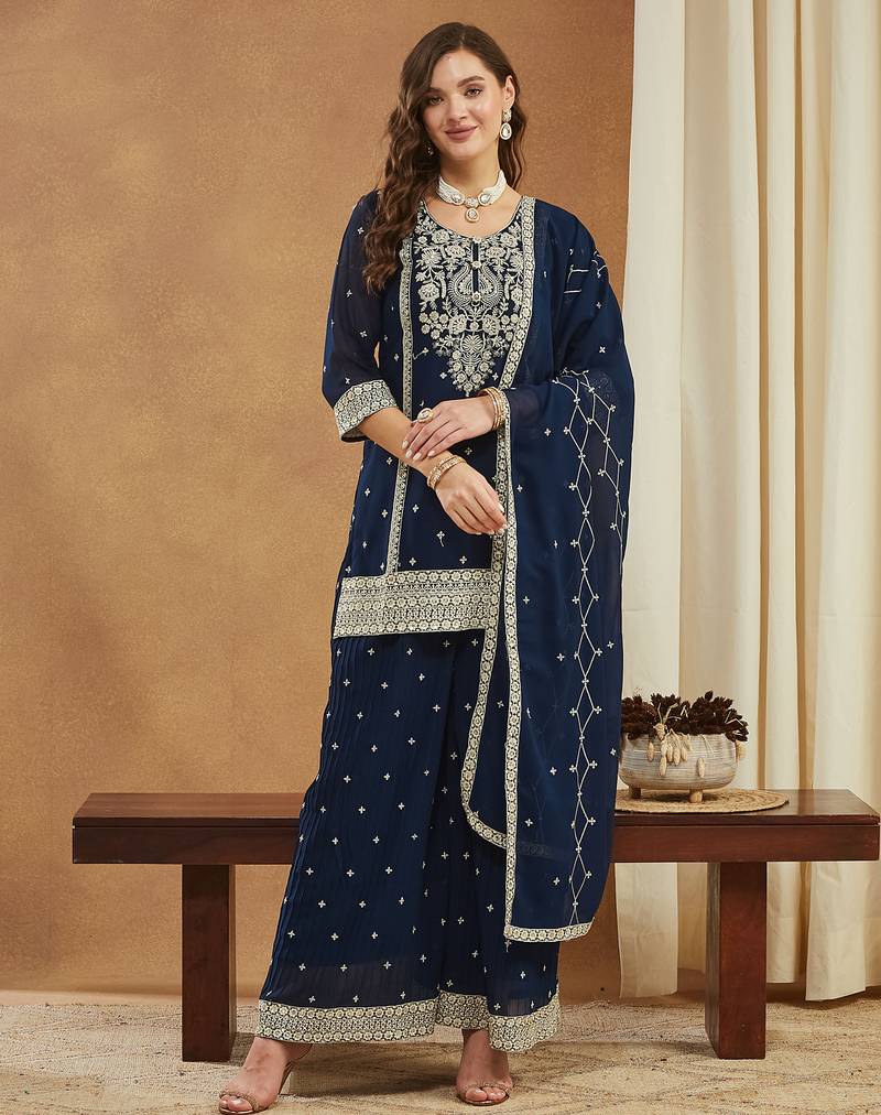 Riva enterprise embroidered navy blue georgette kurta palazzo & dupatta set. stitched