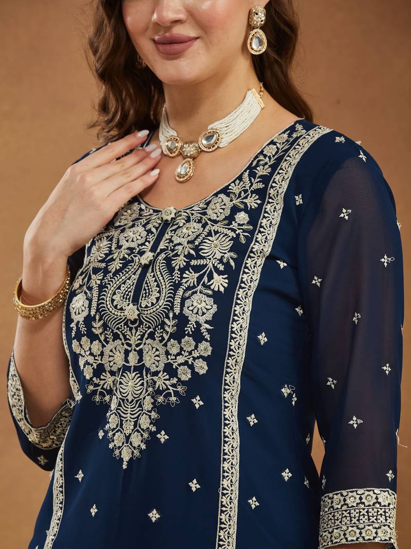 | Product Description | This Stunning Navy Blue Three Piece Ethnic Ensemble Is Crafted From Premium Georgette Fabric And Features Luxurious White Thread Embroidery Combined With Shimmering Sequence Work. The Round Neck Kurti Includes Decorative Buttons At The Neckline And Showcases All Over Embroidery On Both The Front And Back, Along With Sheer 3/4th Sleeves. The Crushed Flared Palazzo Offers A Comfortable Fit With An Inner Lining And Matching Embroidered Design. The Beautifully Bordered Dupatta Is Lightweight, Featuring Lace Detailing And Overall Embroidery, Completing The Outfit With A Graceful Statement Look. |