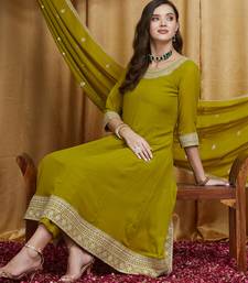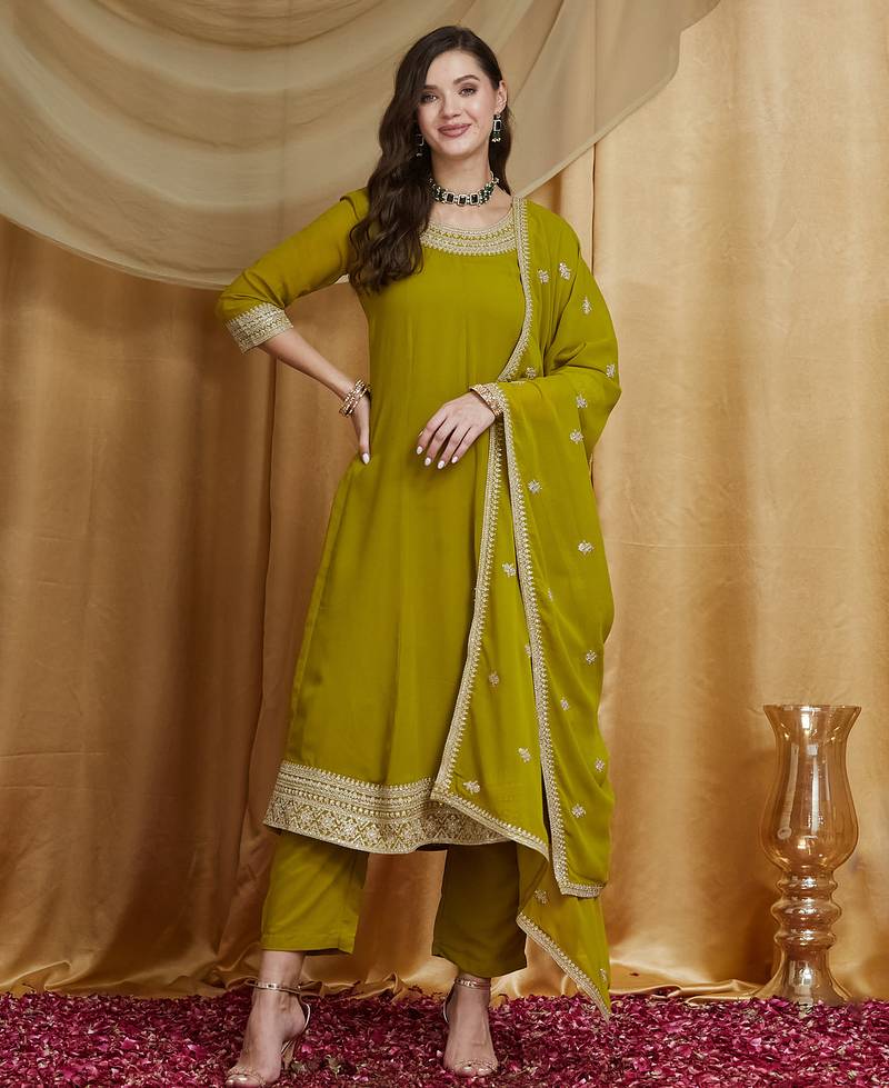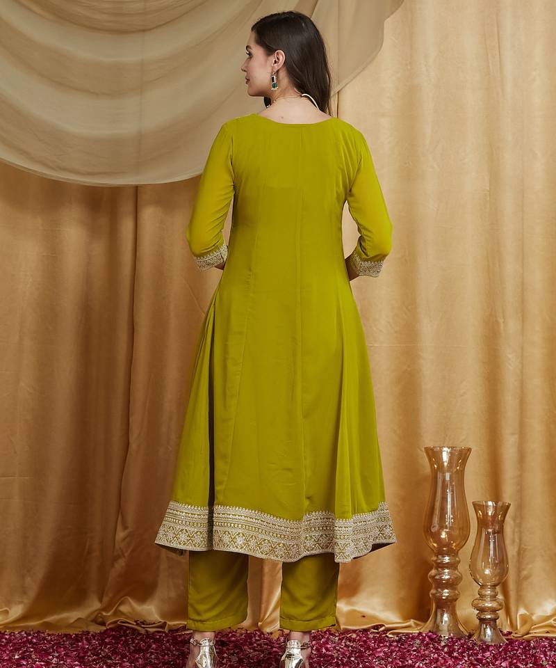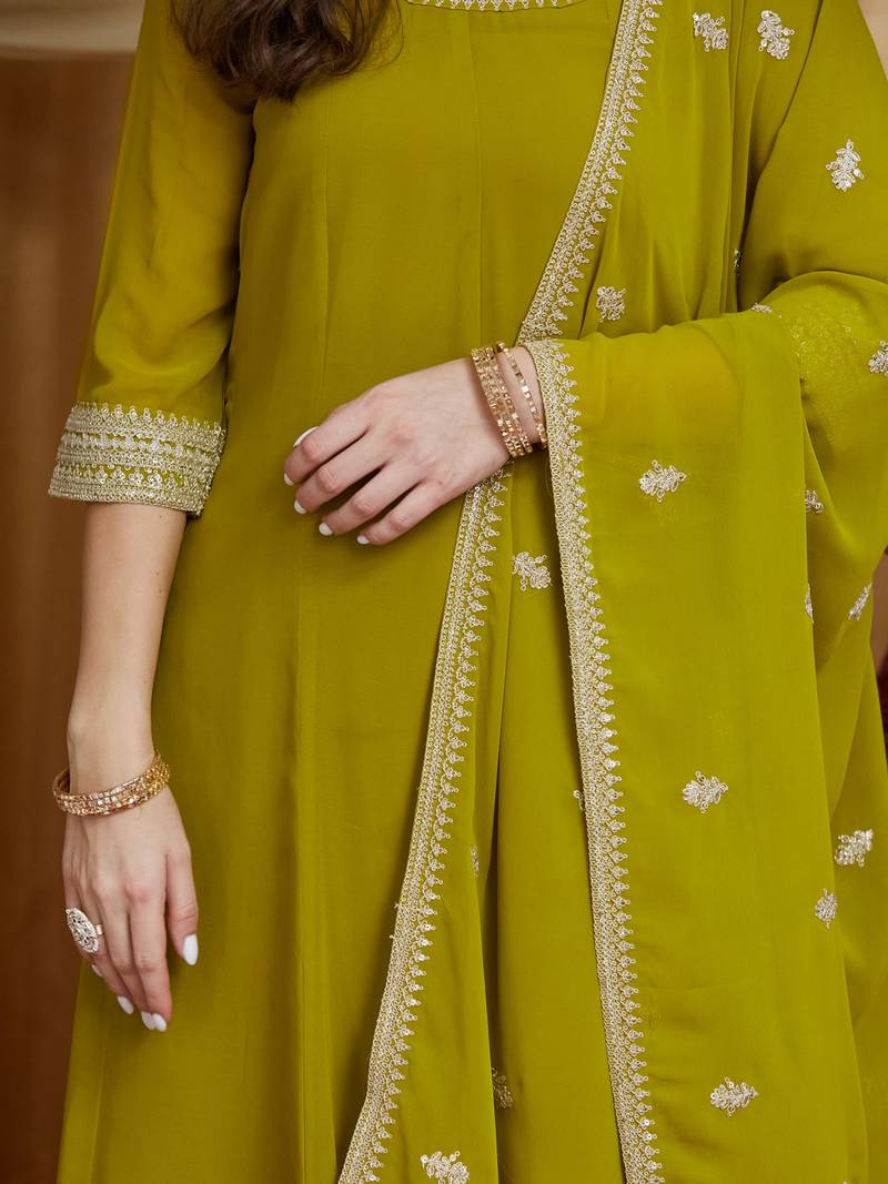| Product Description | This Elegant Olive Green Anarkali Set Is Crafted From Premium Georgette Fabric, Designed To Offer A Rich And Graceful Festive Look. The Set Features A Beautifully Flared Calf Length Anarkali Kurta, Straight Fit Pants, And A Matching Dupatta, All Enhanced With Intricate Cording And Sequin Embroidery Work. The Kurta Comes With A Classic Round Neckline And 3/4th Sleeves, Detailed With Elegant Embroidery On The Neckline, Sleeves, And Hemline. A Full Inner Lining Adds Comfort And Structure, While The Anarkali Flare Adds Fluid Movement To The Silhouette. The Pant Style Bottom, Tailored From The Same Premium Georgette Fabric, Is Also Fully Lined And Features Subtle Embroidery Work, Complementing The Kurta’s Design Perfectly. The 2.25 Meter Dupatta Is Delicately Finished With Lace Detailing And Matching Cording And Sequin Embroidery, Bringing A Balanced And Refined Touch To The Outfit. Perfect For Festive Occasions, Weddings, Or Traditional Gatherings, This Stitched Anarkali Suit Set Blends Timeless Embroidery With A Contemporary Silhouette, Making It A Must Have For Your Ethnic Wardrobe. |