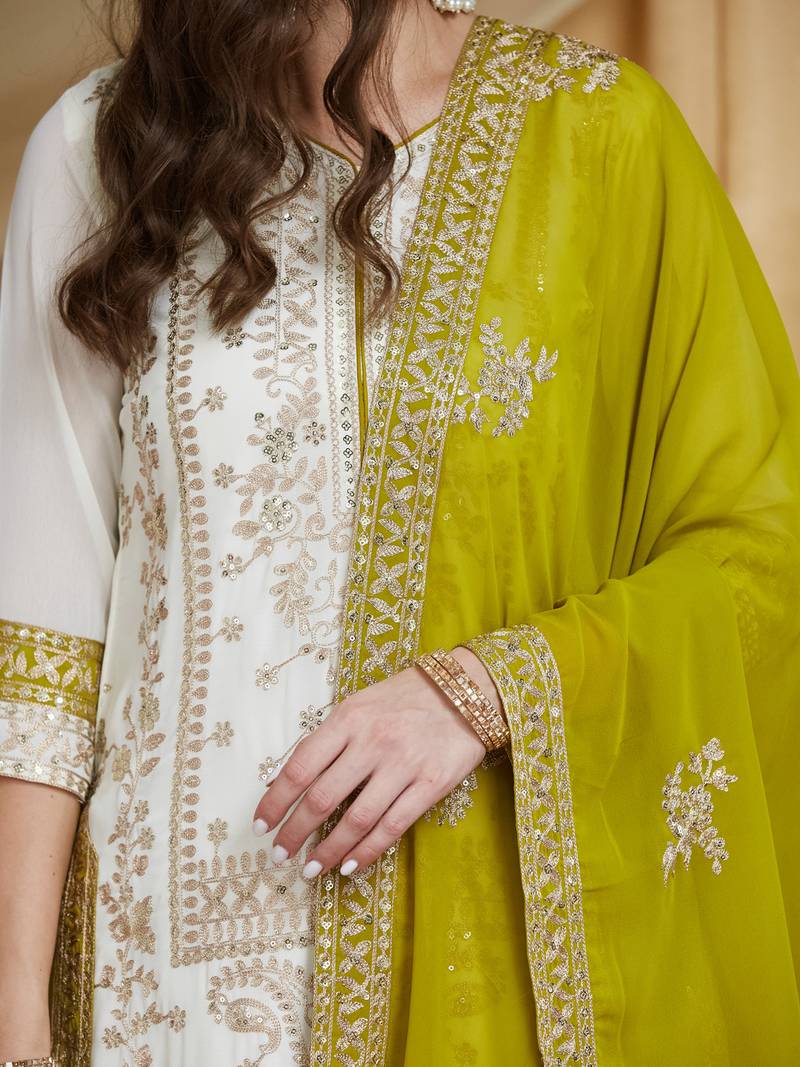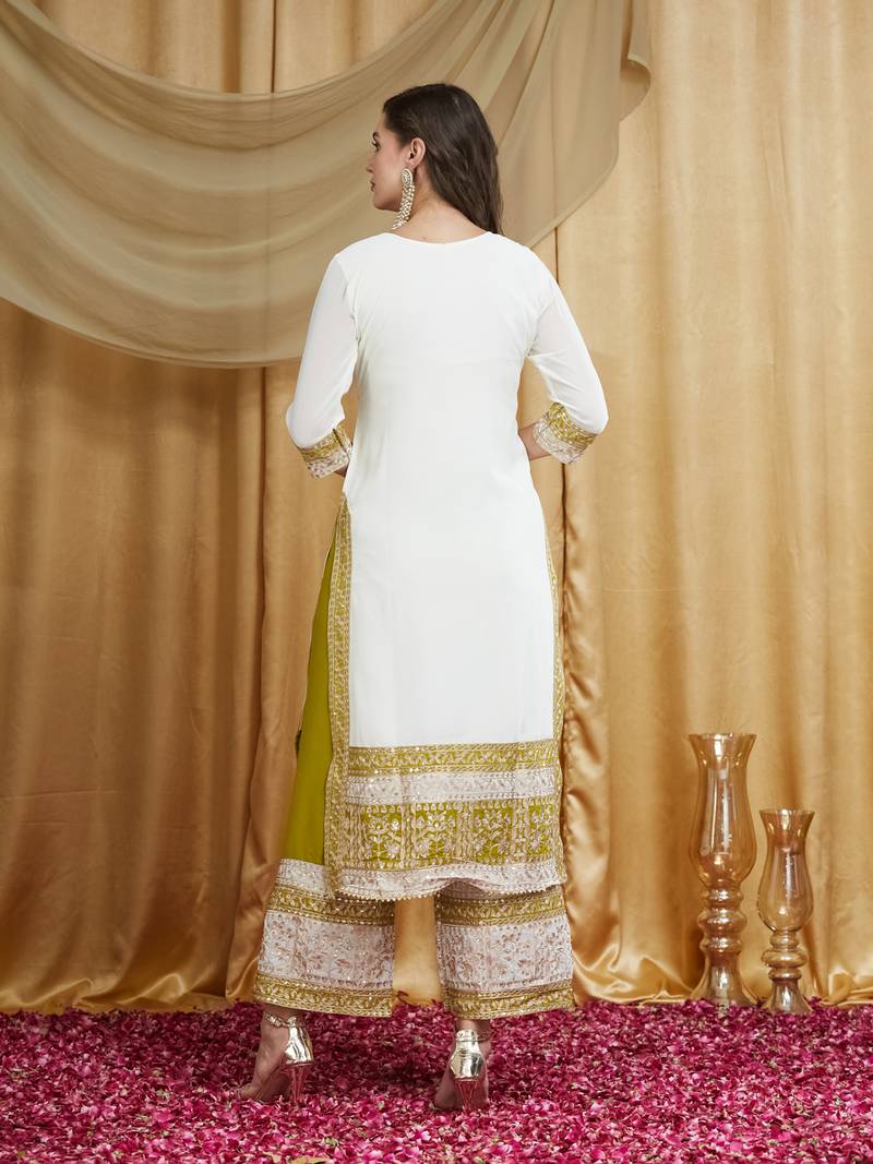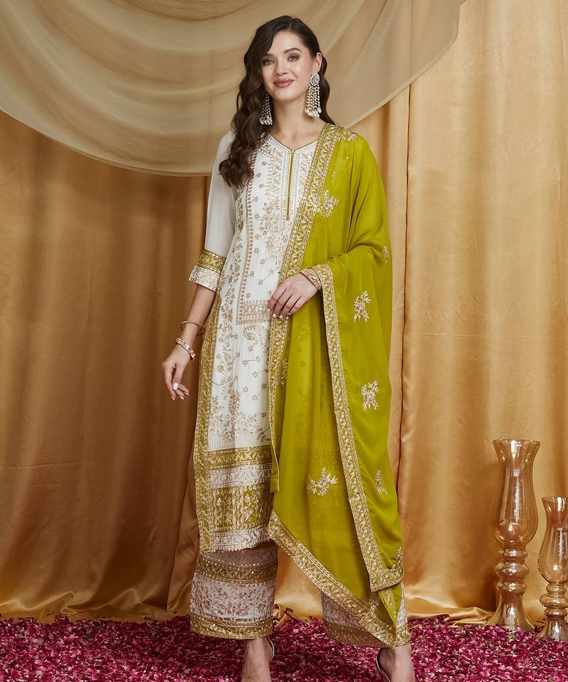 This Luxurious Ensemble Is Crafted From Premium Pure Georgette Fabric, With Each Piece Designed To Create A Truly Opulent Look. The Top Features Intricate Golden Zari Thread Embroidery, Adorned With Sequins And Handwork Across The Entire Front, Offering A Rich And Elegant Appearance. The Bottom, Designed As A Palazzo, Also Showcases Exquisite Golden Zari Thread Embroidery, Beautifully Complementing The Top. The Dupatta Adds A Graceful Touch, Featuring Golden Zari Thread Embroidery Along With Cutwork Details. Together, These Elements Create A Full Pair With Heavy, Extraordinary Embroidery That Gives The Outfit A Majestic Appeal. Styled As A Straight Kurta With Side Slits And Embroidered Sleeves, The Top Is Fully Lined With Inner Fabric For Comfort. The Palazzo Is Also Lined, Offering Ease Of Movement And A Structured Look. This Ready To Wear Outfit Is Perfect For Weddings, Gatherings, Festivals, And Special Events, Providing A Refined And Extraordinary Look For Women Who Want To Make A Statement.