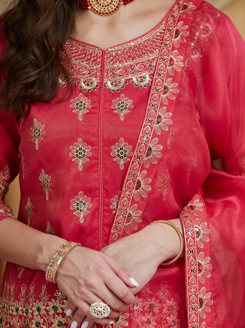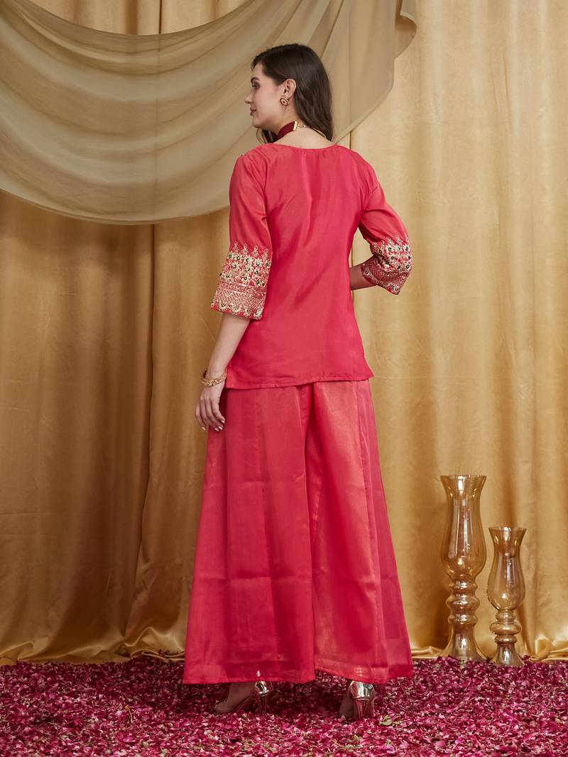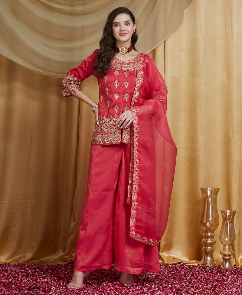 This Radiant Three Piece Set Is Crafted From Premium Shimmer Silk And Organza Fabrics, Making It An Ideal Choice For Festive And Wedding Occasions. The Above Knee Length Kurta Features Exquisite Zari And Sequin Embroidery Work, Beautifully Detailed Along The Round Neckline, 3/4th Sleeves, And Hemline. The Kurta Is Fully Lined And Designed With Elegant Side And Front Slits, Offering Both Comfort And A Modern Silhouette. Paired With A Flared Palazzo Bottom Crafted From Matching Shimmer Silk, The Set Delivers A Luxurious Drape And Graceful Movement. The Palazzo Is Solid In Color And Includes A Full Inner Lining For Added Structure. The Look Is Elevated Further With A 2.25 Meter Lightweight Organza Dupatta, Adorned With Intricate Zari And Sequin Embroidery And Bordered With Elegant Lace Detailing. Whether Worn At A Wedding, Festive Celebration, Or Cultural Gathering, This Stitched Kurta Set Blends Timeless Embroidery With A Contemporary Design, Offering Effortless Elegance And Standout Style.