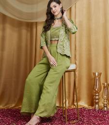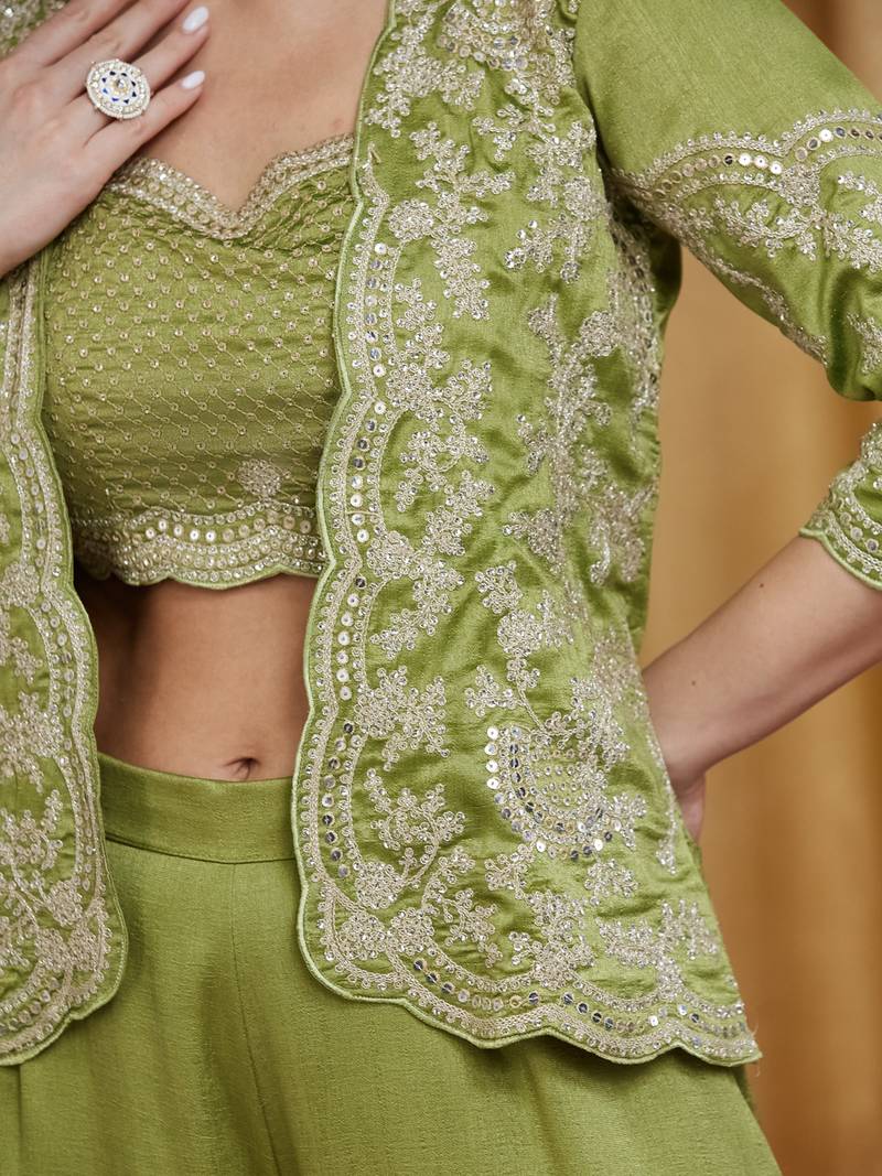 | Product Description | This Elegant Three Piece Ethnic Set Is Crafted From Rich Vichitra Silk Fabric And Features A Fusion Of Modern Style And Traditional Embroidery. The Set Includes A Beautifully Embellished Spaghetti Style Choli (Blouse), A Flared Palazzo, And A Stylish Open Front Embroidered Jacket. The Choli Is Adorned All Over With Intricate Cording And Sequin Embroidery Work, And Features A Scalloped Neckline And Side Zip Closure For A Flattering, Comfortable Fit. The Solid Flared Palazzo, Also Made From Vichitra Silk With Full Lining, Provides A Graceful Silhouette, Making It Perfect For Festive And Party Occasions. Adding To The Charm Is The Matching Above Knee Length Jacket, Detailed With Cording And Sequin Embroidery On The Front, Sleeves, And Edges. Designed With A Front Opening And 3/4th Sleeves, The Jacket Adds A Refined And Layered Dimension To The Outfit. Ideal For Wedding Functions, Receptions, Festive Celebrations, Or Modern Ethnic Events, This Stitched Three Piece Set Effortlessly Combines Glamour, Elegance, And Contemporary Flair. |