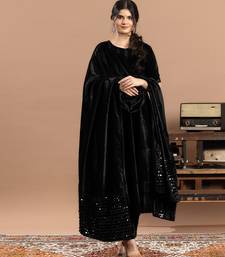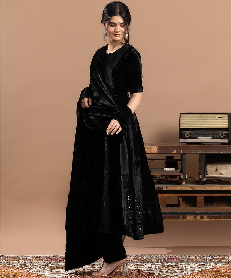 | Product Description | Luxurious And Elegant, This Black Embroidered Velvet Anarkali Set Is Crafted From Rich Velvet Fabric, Offering A Soft, Plush Feel And Graceful Drape. Adorned With Intricate Embroidery, It Exudes Sophistication And Charm. Perfect For Weddings, Festive Celebrations, And Special Occasions, Adding A Regal Touch To Your Ethnic Wardrobe.