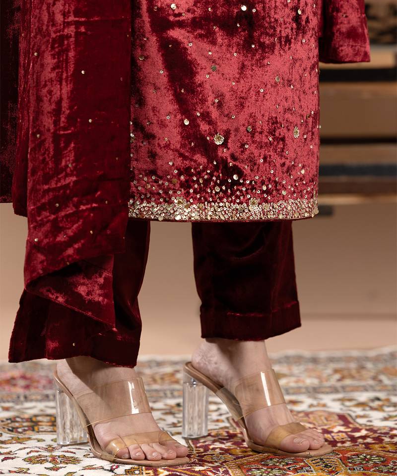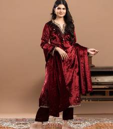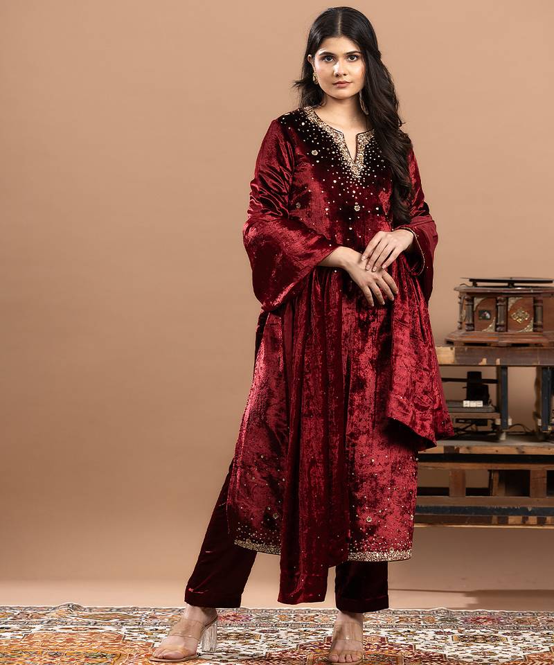 Luxurious And Elegant, This Maroon Embroidered Velvet Anarkali Set Is Crafted From Rich Velvet Fabric, Offering A Soft, Plush Feel And Graceful Drape. Adorned With Intricate Embroidery, It Exudes Sophistication And Charm. Perfect For Weddings, Festive Celebrations, And Special Occasions, Adding A Regal Touch To Your Ethnic Wardrobe.