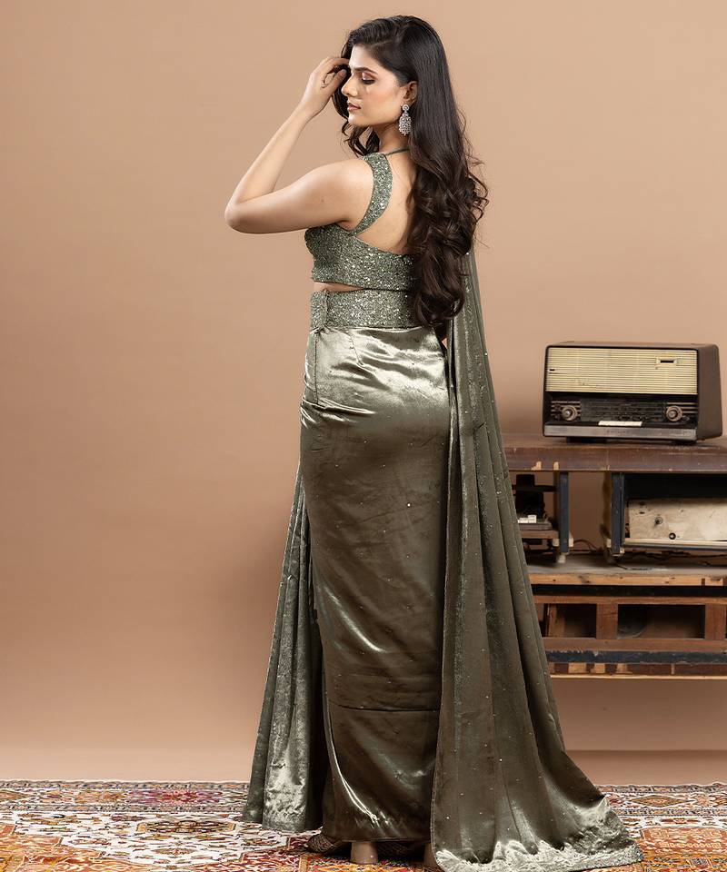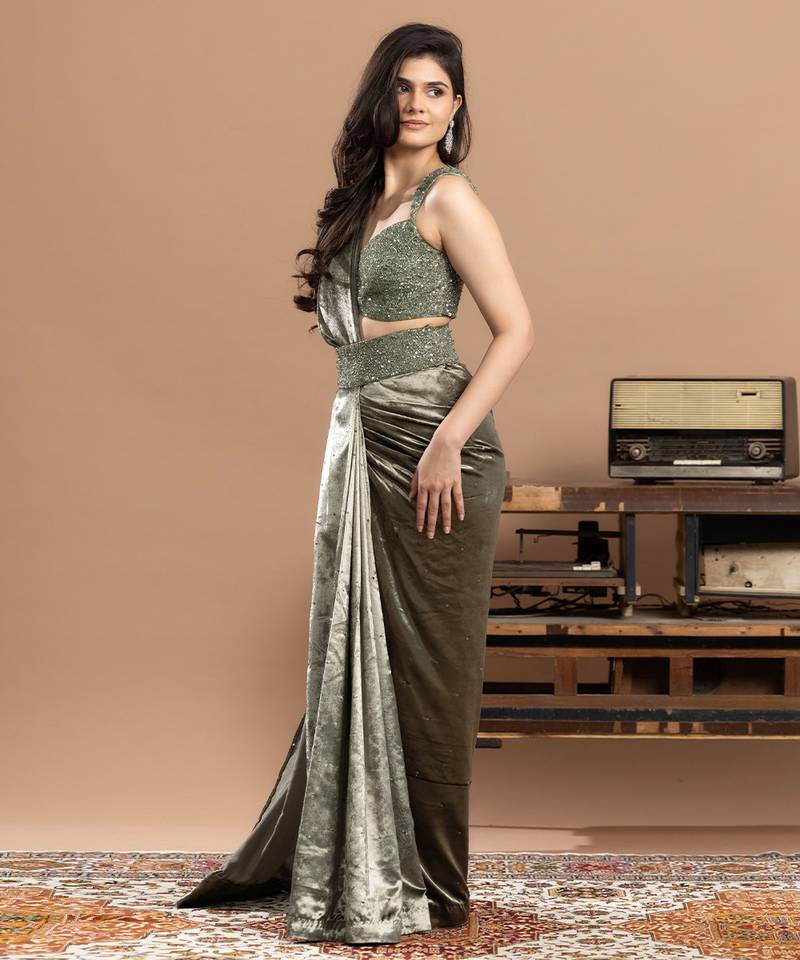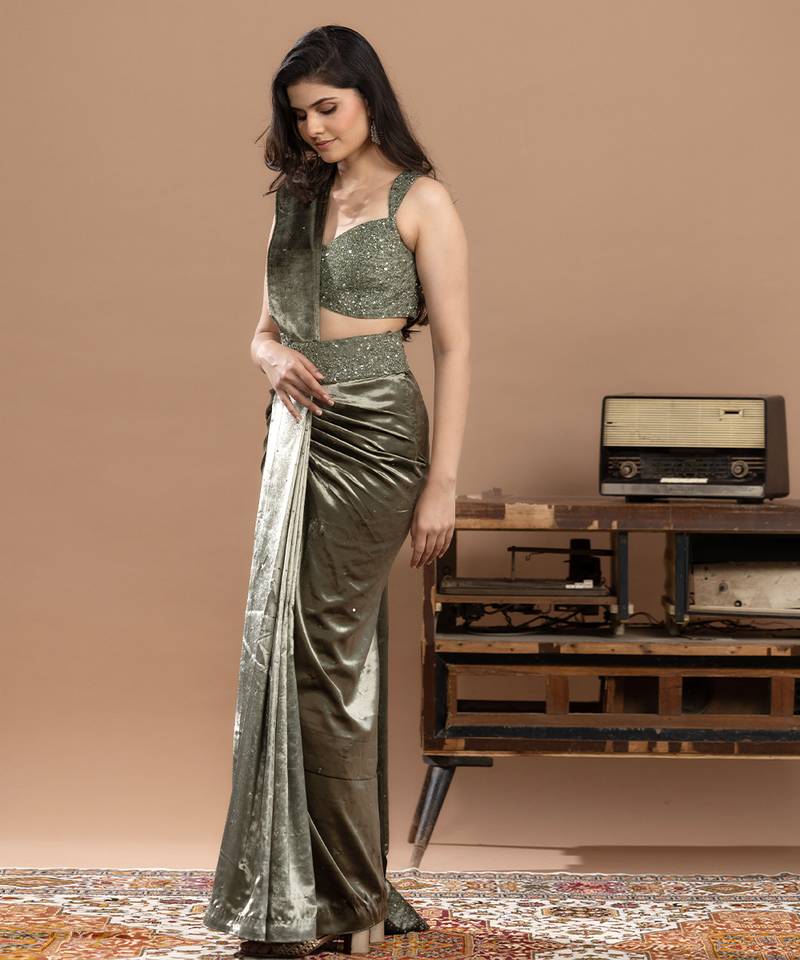 Product Name Sage Green Embroidered Velvet Saree