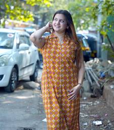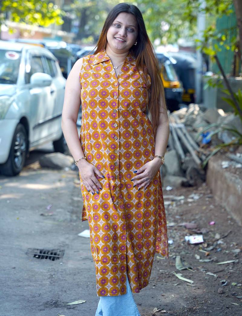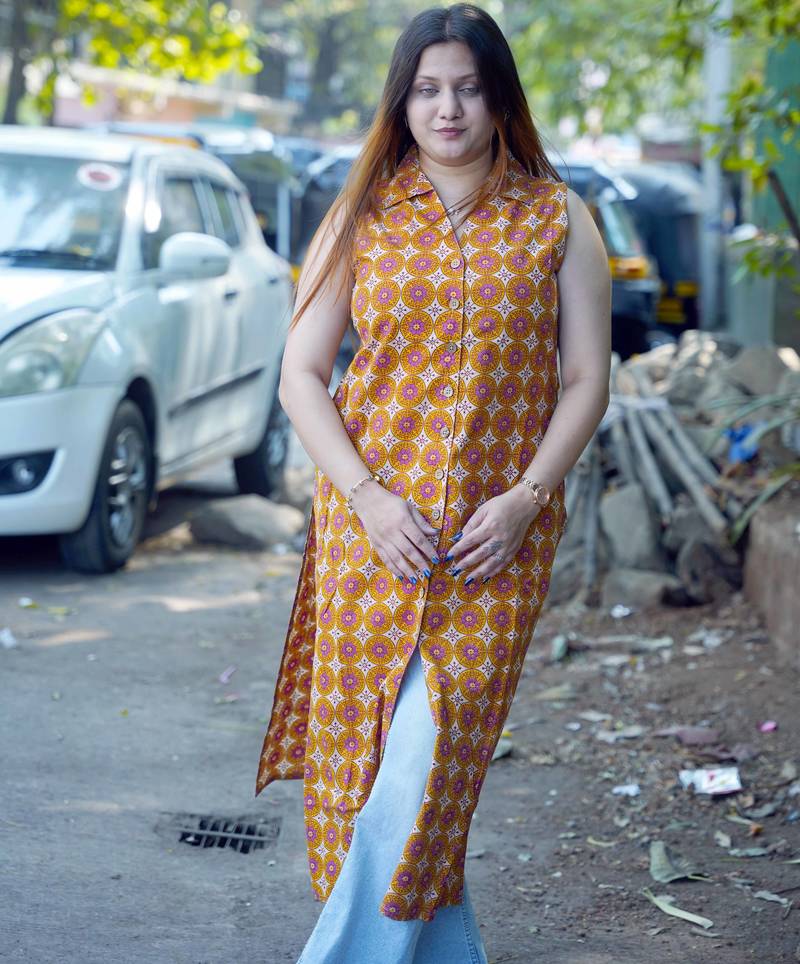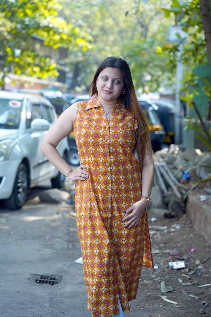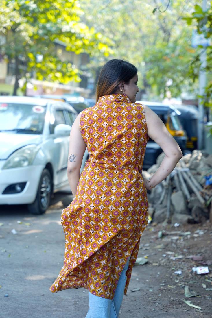 | Product Name | Sleeveless Mustard Hand Printed Cotton Long Kurti | |