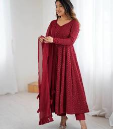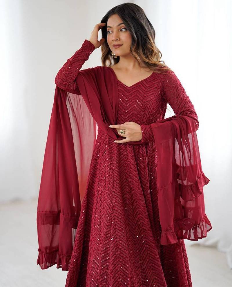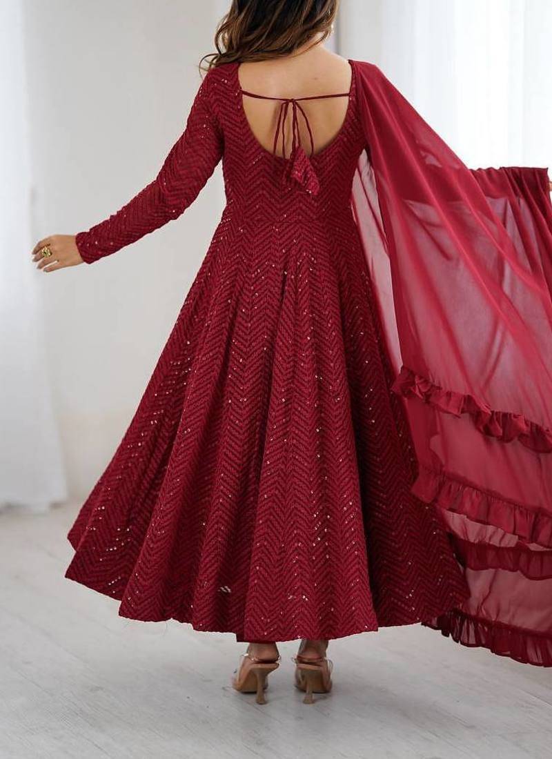 | Product Name | Maroon Soft Georgette Lucknowi Sequins Anarkali With 4 Mtr Flair, Stitched Pant And Ruffle Dupatta Set | |