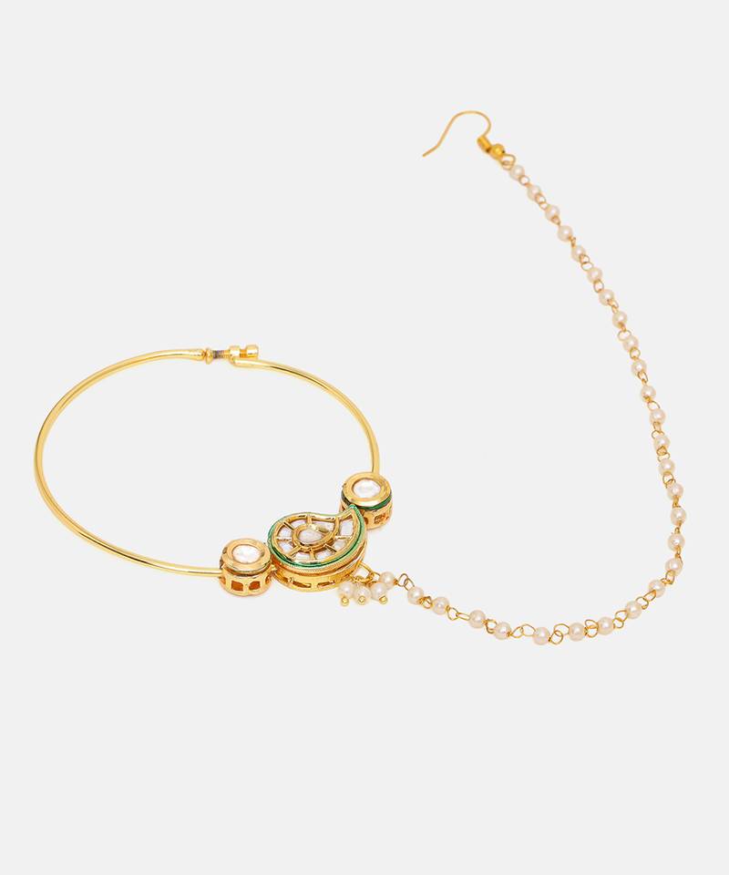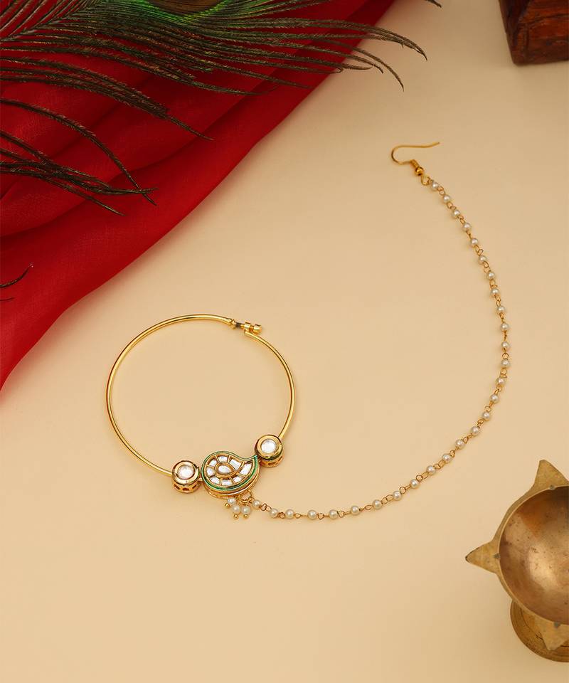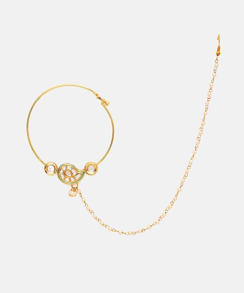 | Product Name | Gold Plated Kundan Green Stone Nose Ring With Chain | |