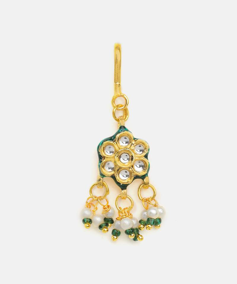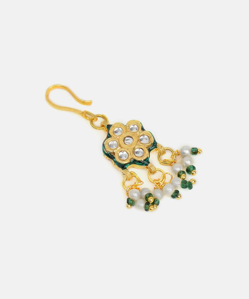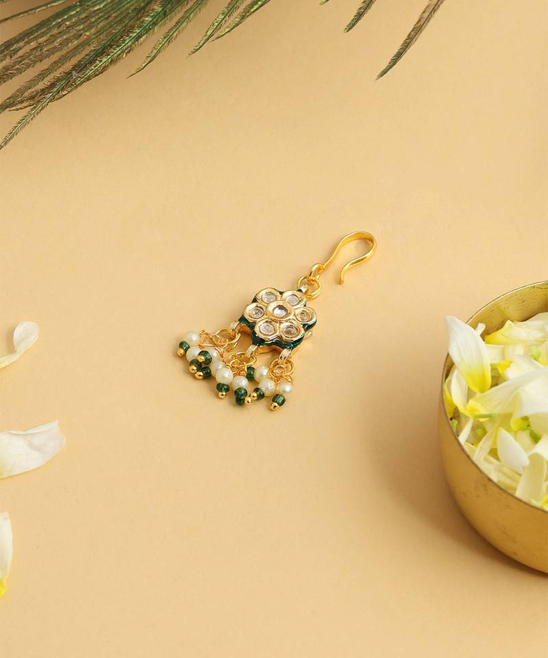 This Gold Plated Kundan Hair Clip Is Adorned With Rich Green Stones That Exude Royal Elegance. Its Detailed Craftsmanship Highlights Traditional Charm While Securing Hair Firmly. Perfect For Wedding Functions And Celebrations, It Adds A Luxurious Touch To Hairstyles And Complements Ethnic Outfits Beautifully.