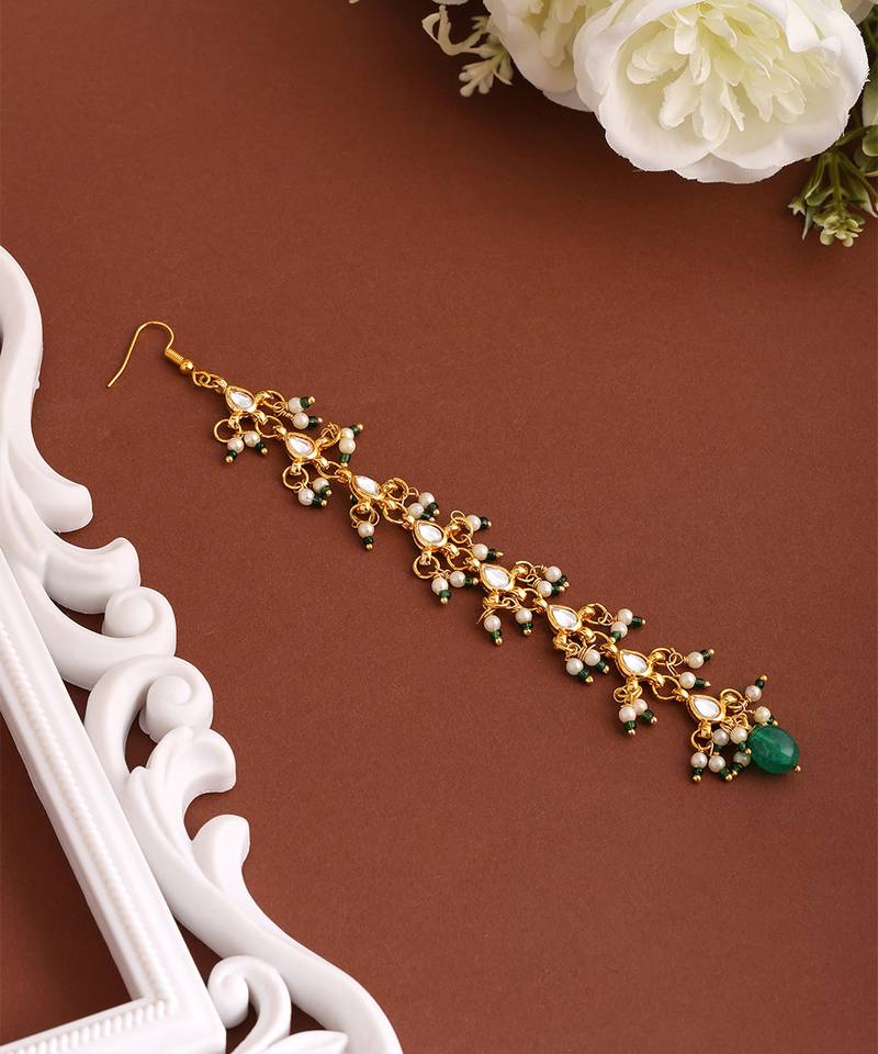 | Product Description | This Gold Plated Kundan Green Stones Maang Tikka Blends Tradition With Sophistication. Designed With Intricate Kundan Work And Deep Green Stones, It Offers A Luxurious Bridal Accent. Perfect For Festive And Wedding Wear, This Maang Tikka Enhances Ethnic Outfits With Timeless Grace And Style.