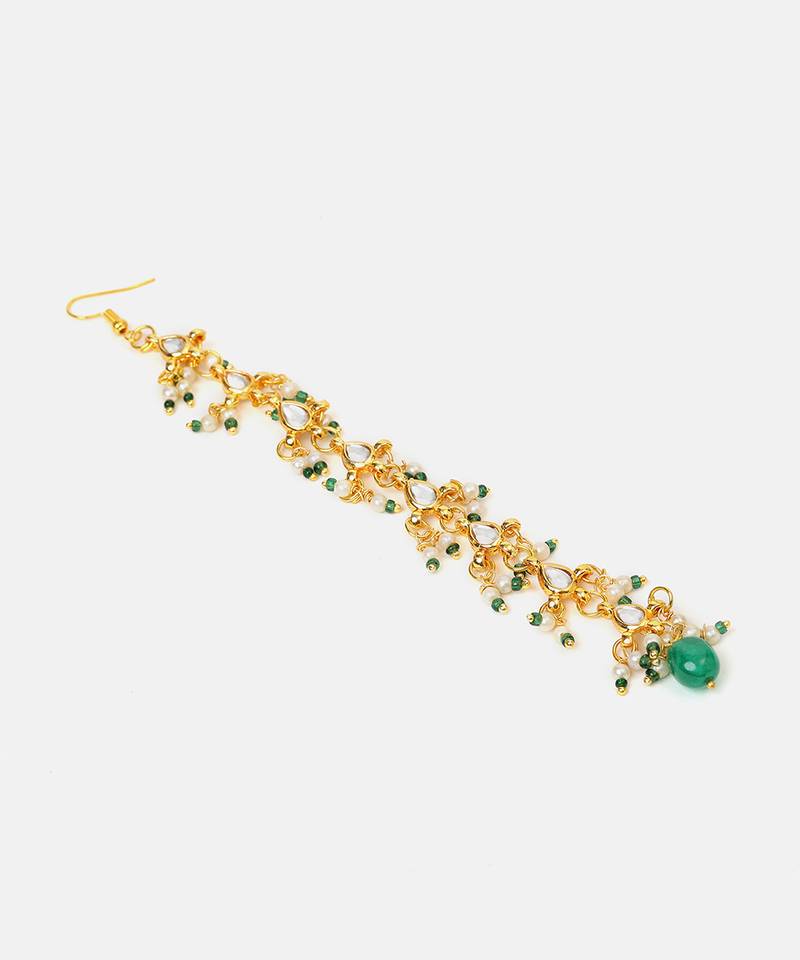 Gold plated kundan green stones maang tikka