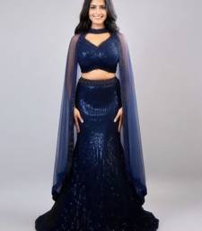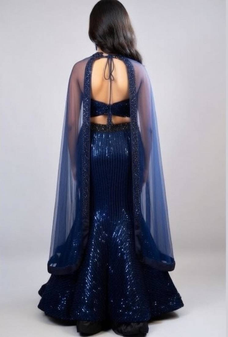 | Product Name | Navy Blue Vertical Sequin Mermaid Cut Lehenga With Cape Sleeve Halter Blouse | |