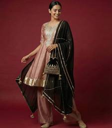 | Product Description | This Elegant Kurta Set Is Crafted In A Rich Onion Pink Hue With A Soft, Lustrous Finish That Adds A Graceful Festive Appeal. The Kurta Is Made From Vichitra Silk And Features Intricate Gold Embroidery, Highlighted With Decorative Neck Patches And Finely Detailed Sleeve Borders. A Broad Metallic Gold Hemline Border Enhances The Refined Look Of The Ensemble. It Is Paired With A Sheer Organza Dupatta In Contrasting Black, Beautifully Finished With Gold Lace Edging And Subtle Sequin Detailing, Adding Fluidity And Elegance To The Drape. The Matching Bottom Completes The Set, Offering A Balanced And Coordinated Silhouette. Measurements: