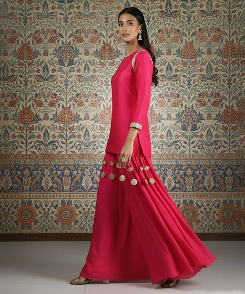 This Elegant Pink Kurta Palazzo Set Is Crafted In Premium Vichitra Silk, Offering A Smooth Texture And Graceful Drape. The Kurta Features A Clean Straight Silhouette, Enhanced With Delicate Kota Flower Appliqué Detailing And Refined Gold Lace Accents Along The Neckline And Sleeve Hems, Adding Subtle Festive Charm. The Matching Red Palazzo Bottom Flows Beautifully And Is Adorned With Kota Flower Embellishments, Creating A Coordinated And Sophisticated Look. Designed For Comfort And Elegance, This Ensemble Is Perfect For Festive Occasions And Celebratory Gatherings.