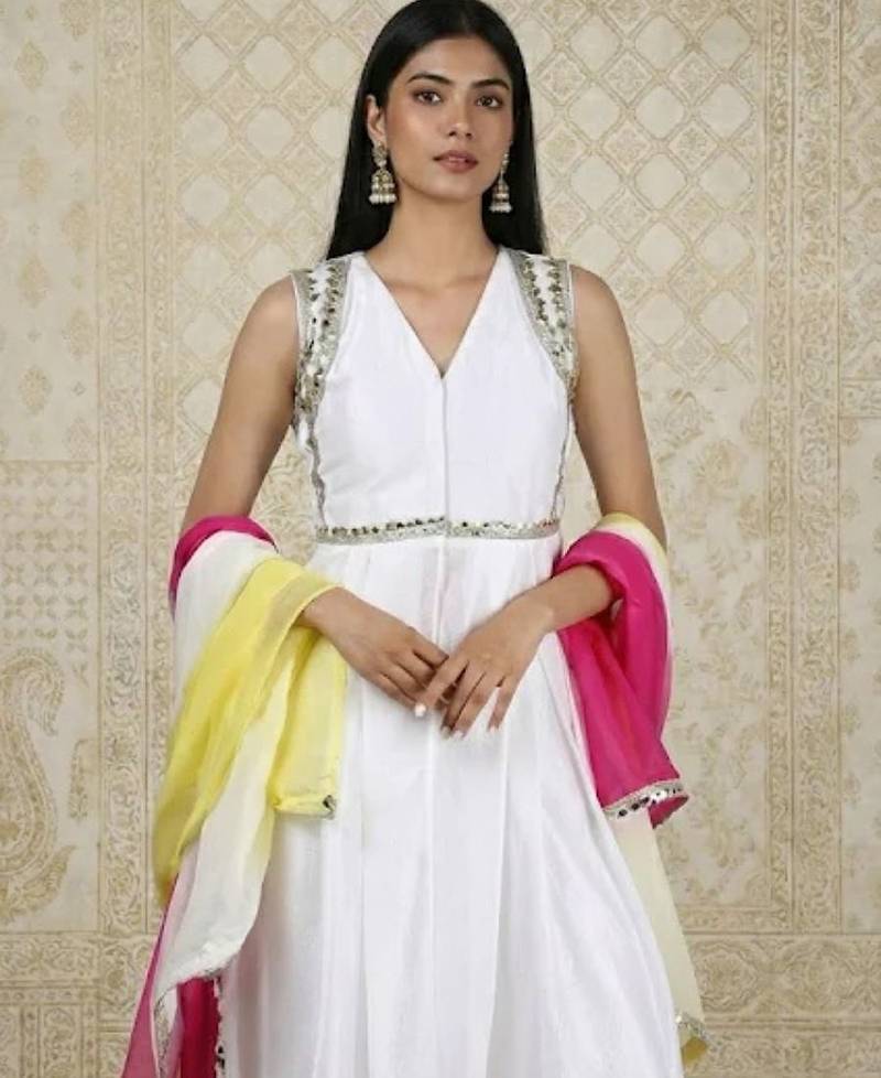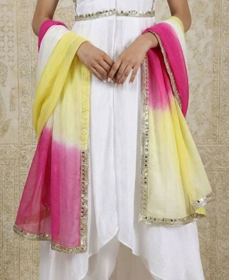 A Stunning Visual Impact With This Pristine White Dhoti Set Featuring A Sleeveless High Low Kurta Adorned With Shimmering Mirror Work Borders. The Chic Ensemble Is Paired With Comfortable Dhoti Pants And Elevated By A Vibrant Pink And Yellow Dual Tone Dupatta, Adding A Playful Pop Of Color To The Monochromatic Look.