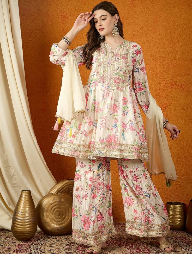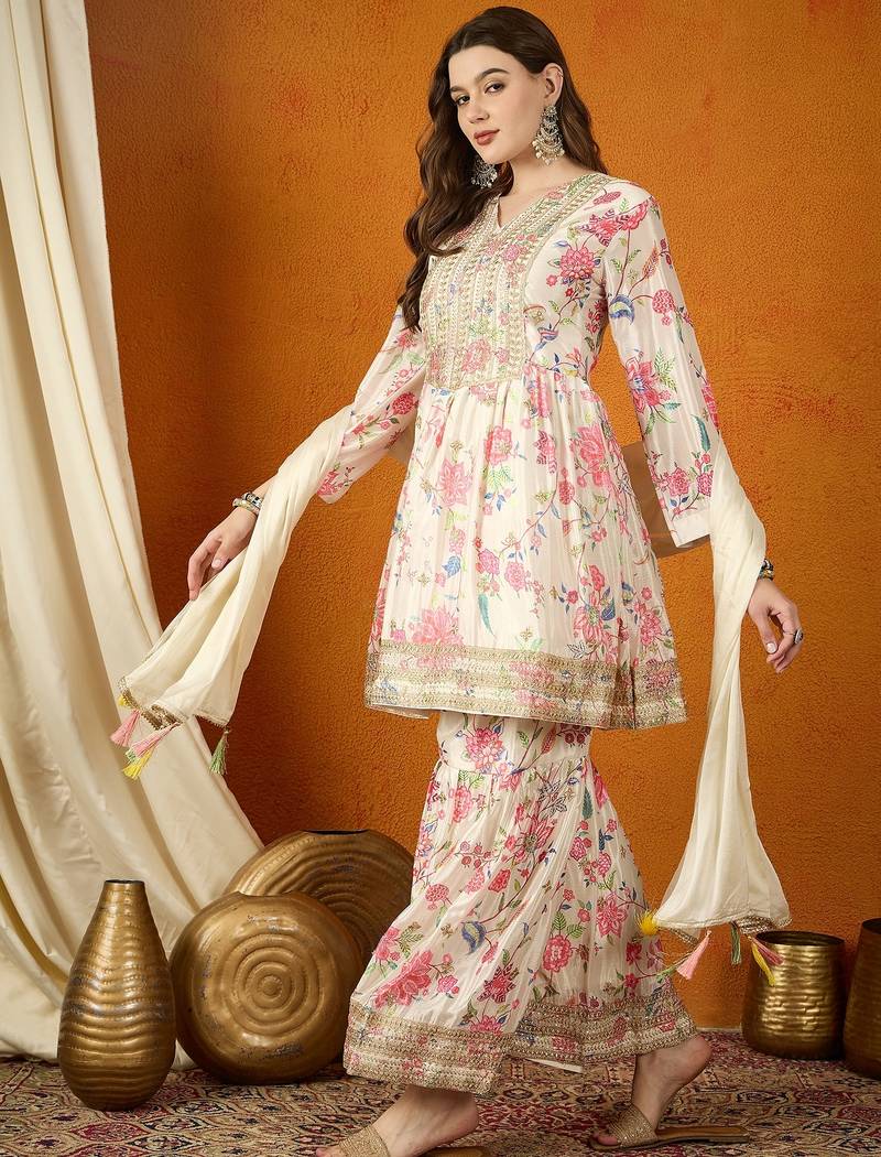 Product Name Cream Embroidered Chinon Anarkali Kurta Sharara Set With Lace Dupatta