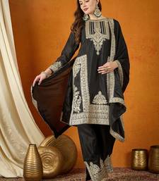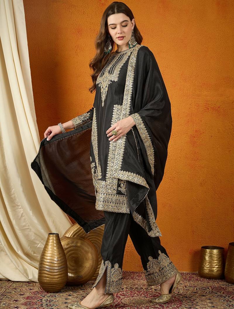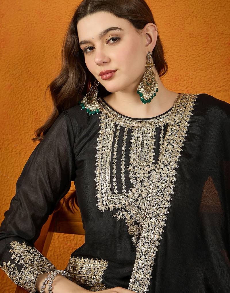 | Product Description | Command Attention In This Sophisticated Black And Gold Silk Suit. The Ensemble Features Bold, Architectural Embroidery And A Contrasting Copper Lined Dupatta. This Striking Combination Of Deep Black And Metallic Gold Creates A Powerful, High Fashion Ethnic Look Suitable For Formal Galas And Winter Weddings. |