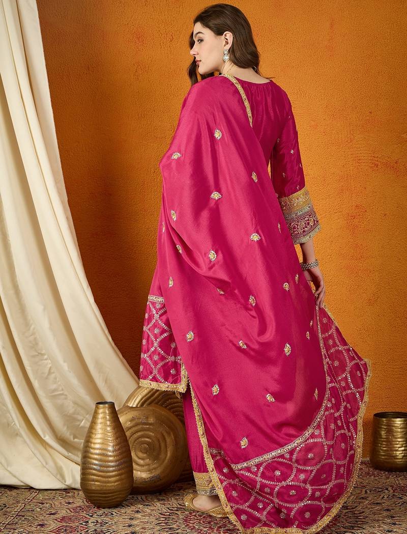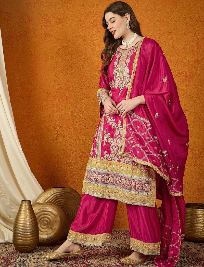 | Product Description | Elegant Dark Pink Kurta Palazzo Set Crafted In Premium Chinon Fabric For A Smooth And Flowy Drape. Straight Embroidered Kurta With A 46 Inch Length, Fully Stitched And Ready To Wear. Matching Chinon Palazzo Pants With Soft Santoon Inner, Stitched For Comfort And Ease. Beautiful Embroidered Chinon Dupatta With A 2.15 Meter Length For A Complete Ethnic Look. Ideal For Festive Wear, Parties, And Traditional Occasions. |