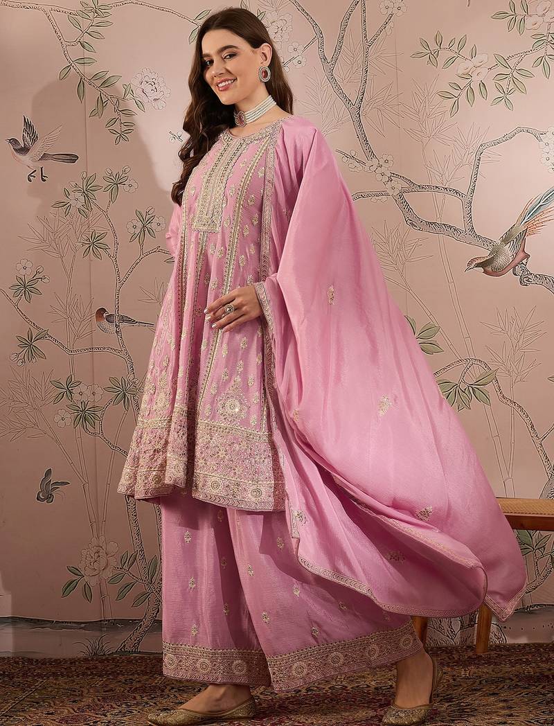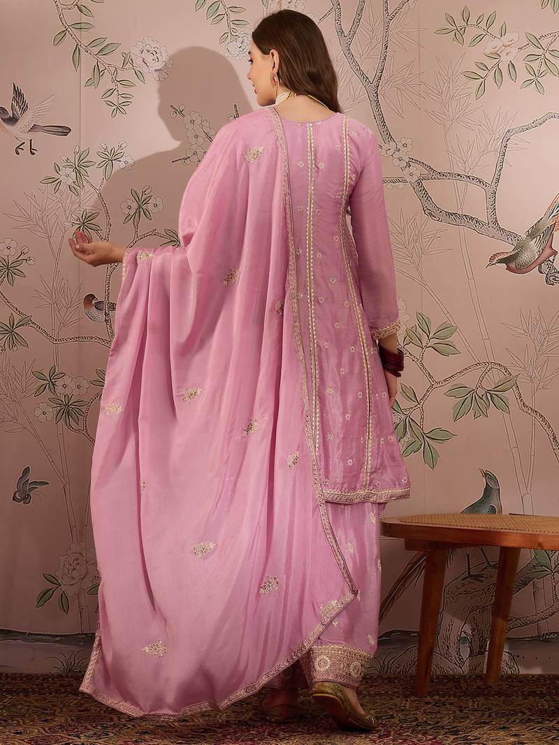 | Product Name | Saahmriga Embroidered Light Pink Chinon Round Neck Regular Sleeve Kurta Palazzo Sets | |
