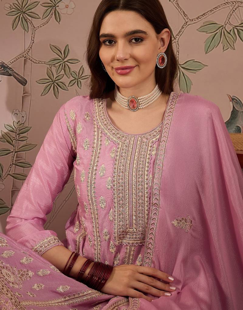 Saahmriga embroidered light pink chinon round neck regular sleeve kurta palazzo sets stitched