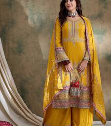 | Product Name | Saahmriga Embroidered Yellow Chinon Round Neck Flared Sleeve Kurta Palazzo Sets | |