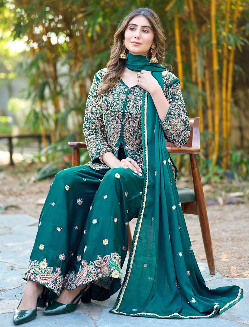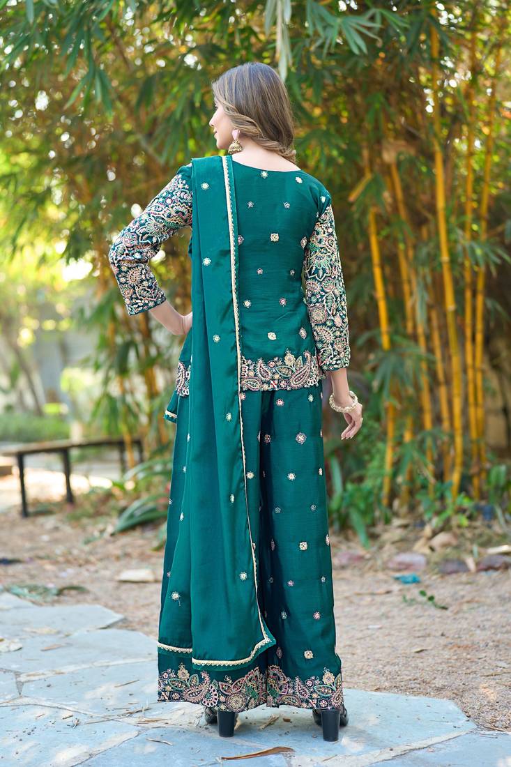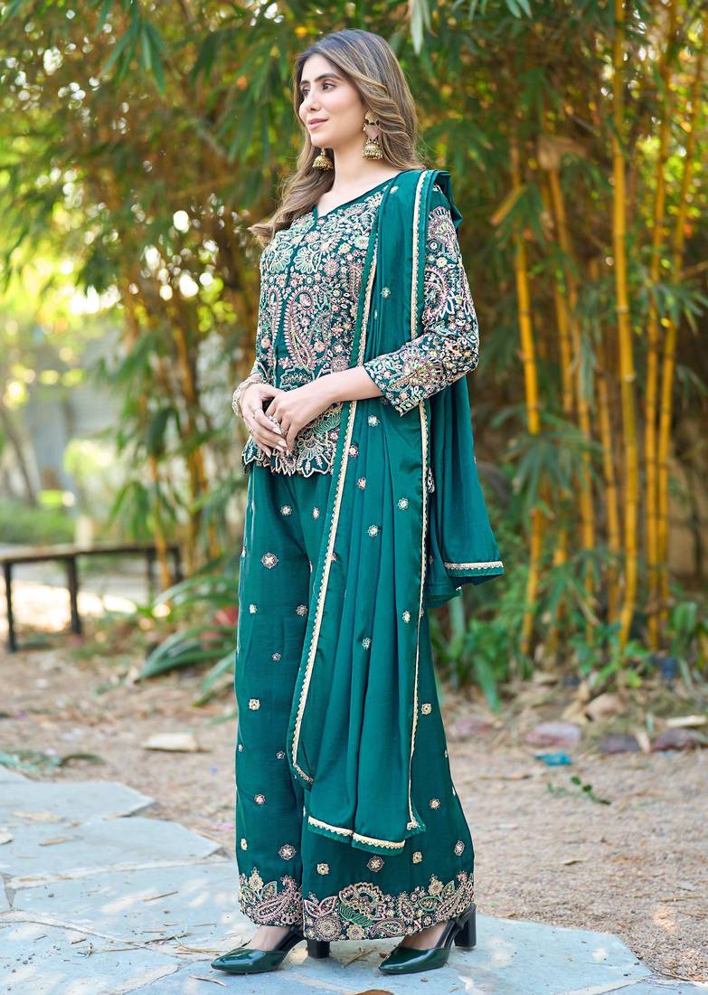 Elegant Green Kurta Palazzo Set Crafted In Premium Chinon Fabric For A Rich And Stylish Ethnic Look.