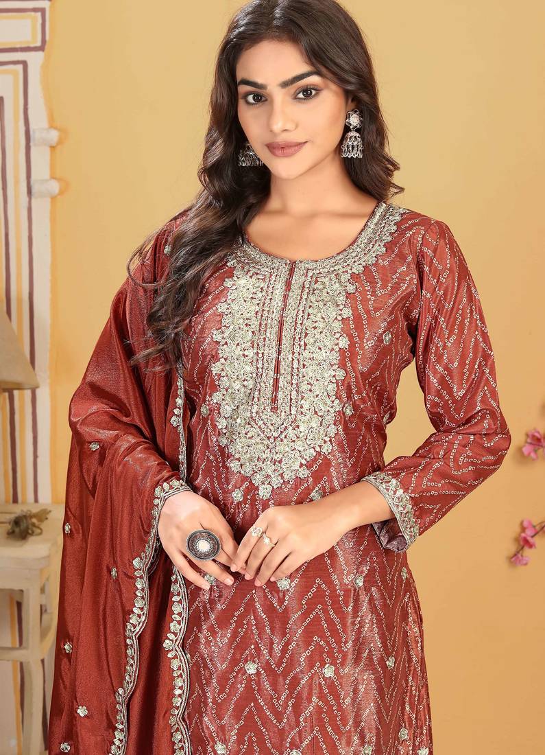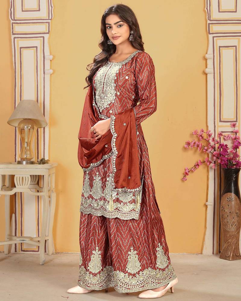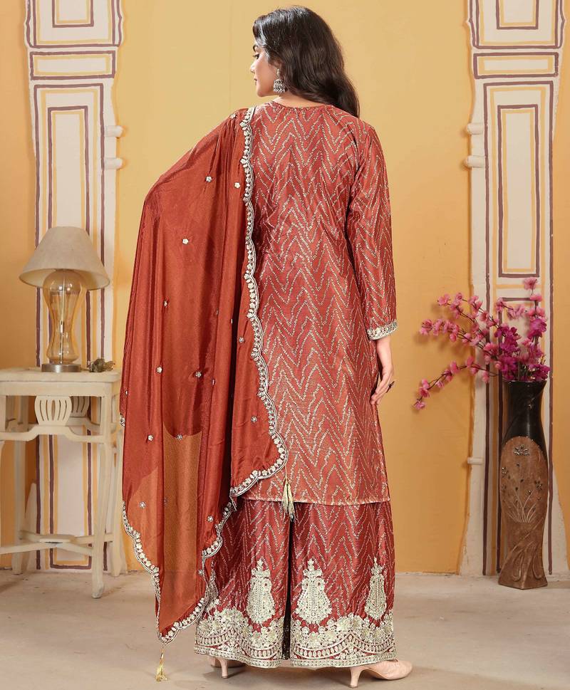 | Product Description | Elegant Rust Straight Kurta Palazzo Set Crafted In Premium Chinon Fabric For A Rich And Graceful Ethnic Look. Beautifully Embroidered Straight Kurta With A Flattering 40 Inch Length, Fully Stitched And Ready To Wear. Matching Chinon Palazzo With Soft Santoon Inner Ensures Comfort And Ease Of Movement. Paired With An Embroidered Chinon Dupatta (2.15 Meters) For A Complete Festive And Traditional Ensemble. ✨ |