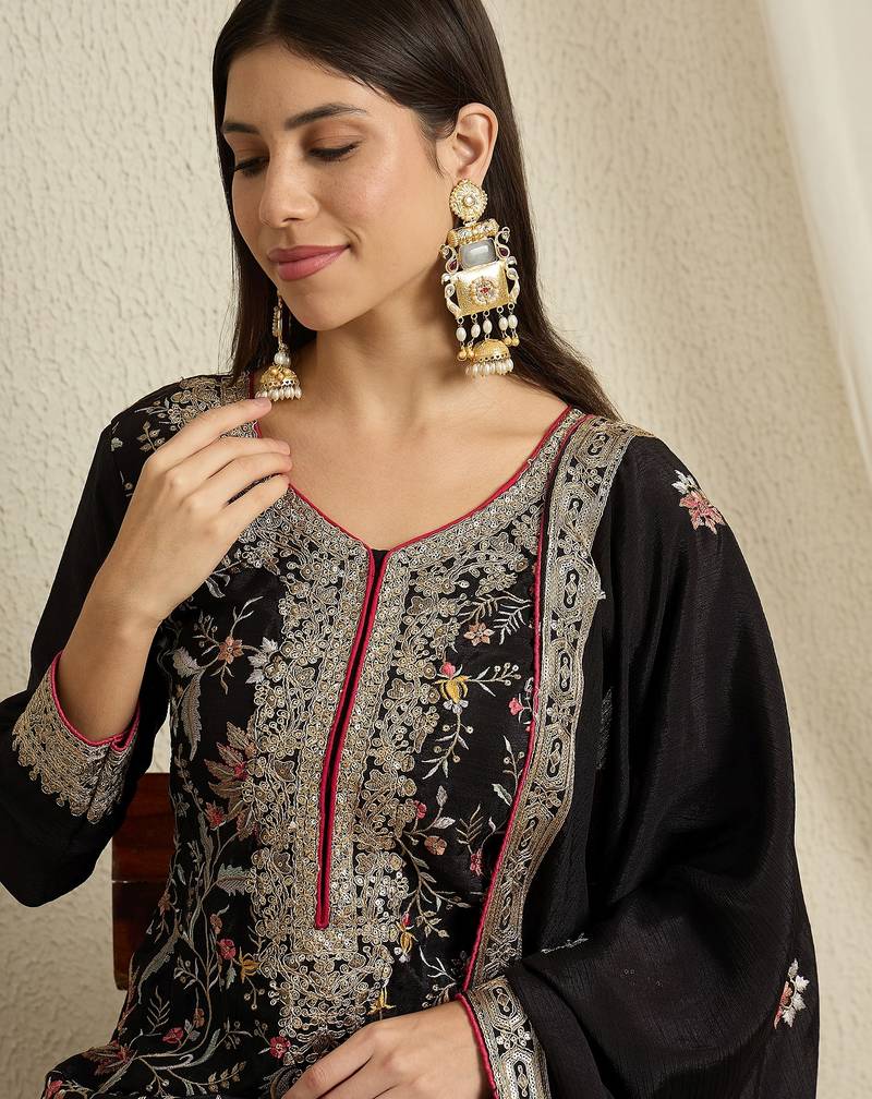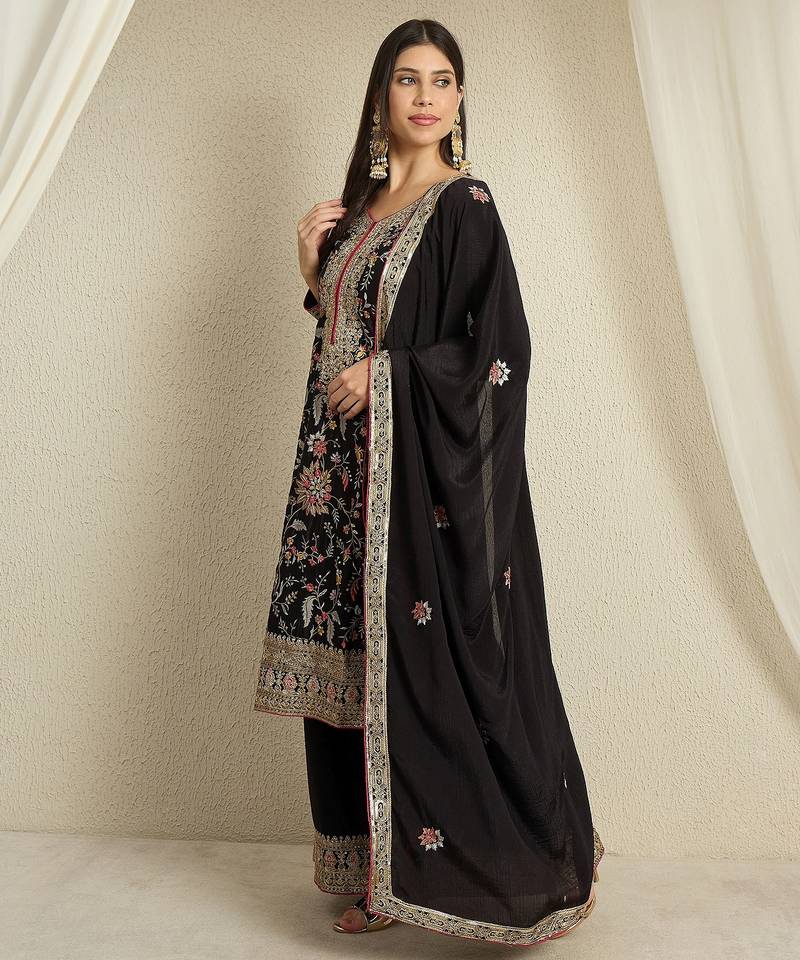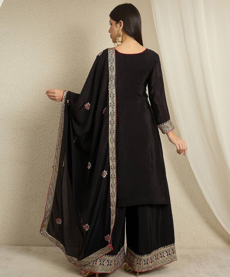 | Product Name | Black Chinon Top With Bottom And Dupatta Full Sleeve Embroidered Kurta Palazzo Set | |