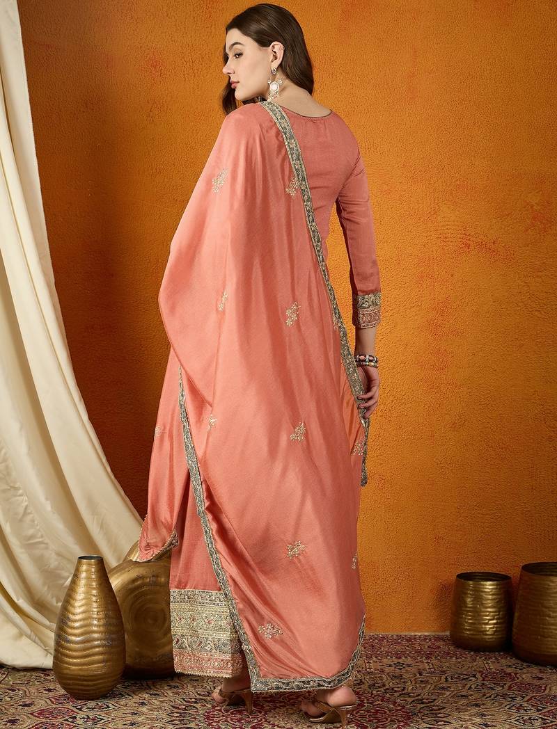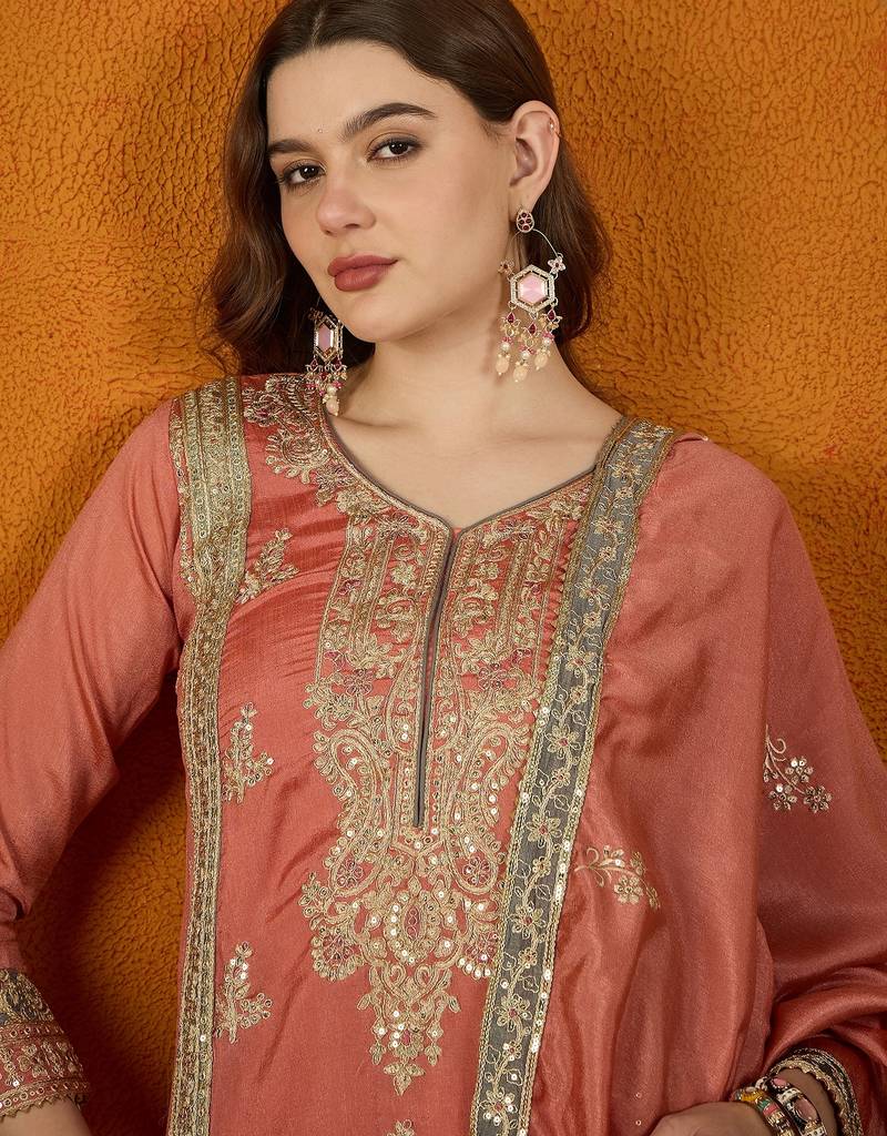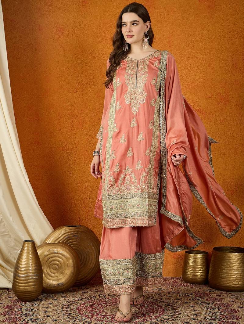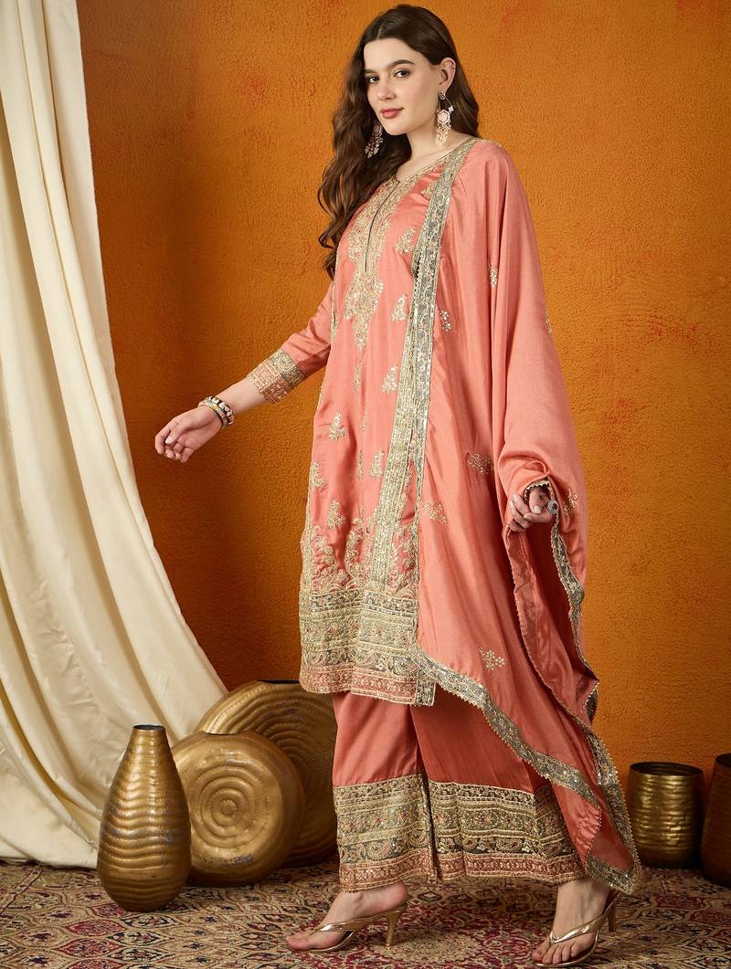 | Product Description | Soft Peach Straight Kurta Crafted From Lightweight Chinon Fabric. Embroidered Detailing Enhances The Festive And Refined Appeal. Stitched Palazzo With Santoon Lining For Comfort And Flexibility. Matching Embroidered Dupatta Completes The Ethnic Look. Ideal For Parties, Festive Events, And Family Occasions. |