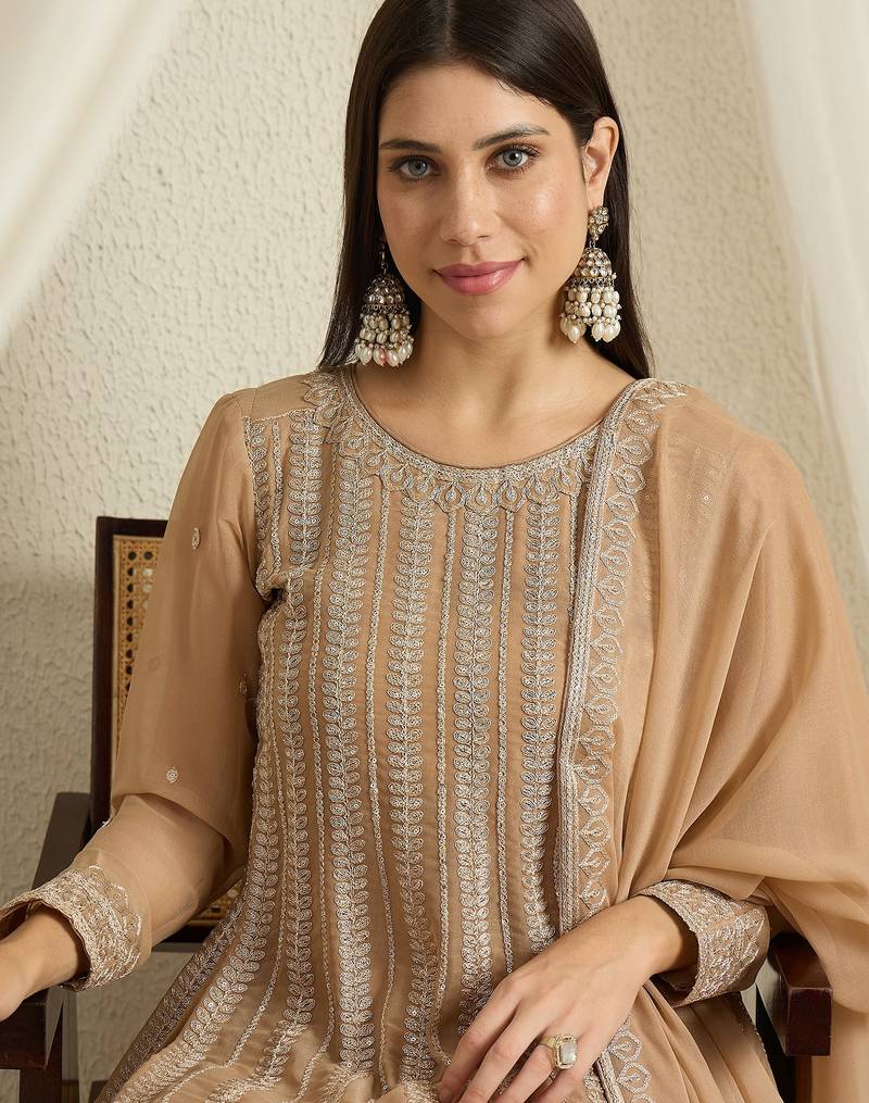 Coffee georgette top with bottom and dupatta full sleeve embroidered a-line kurta palazzo set stitched