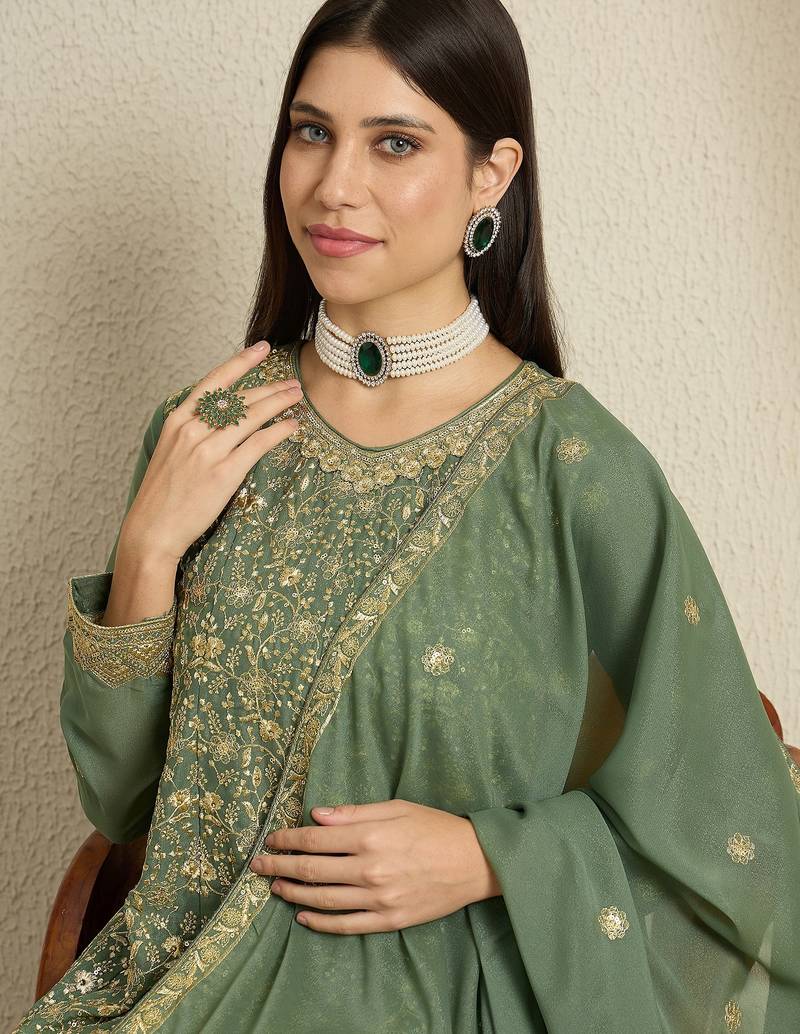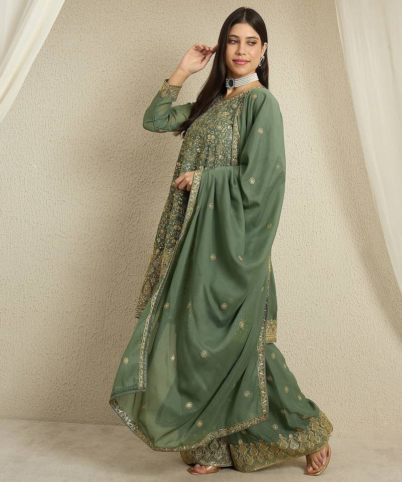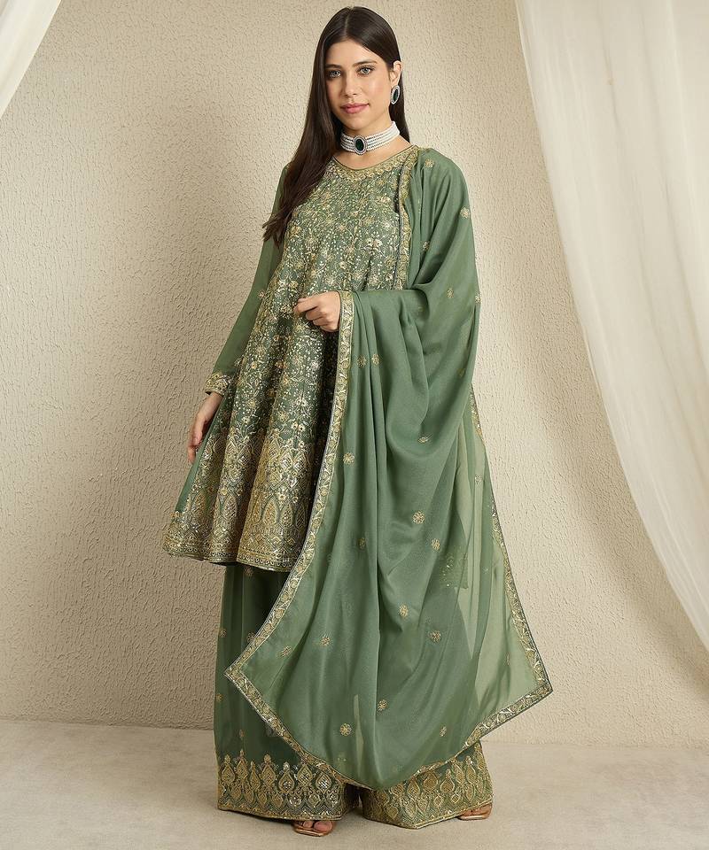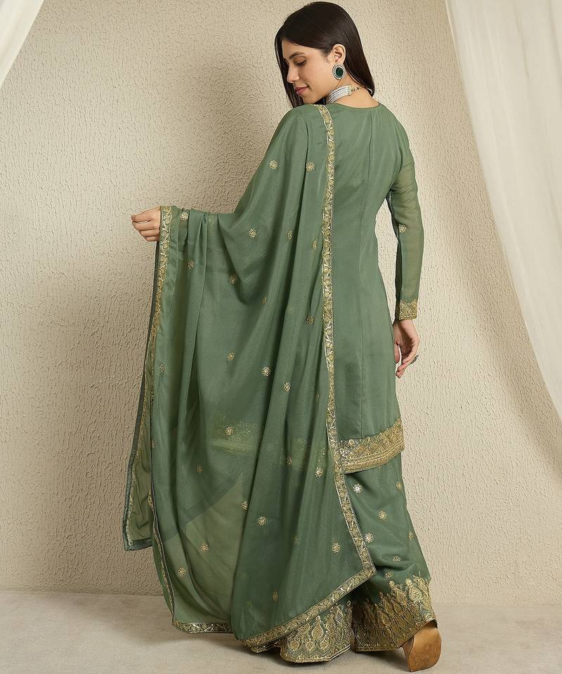 | Product Name | Green Georgette Top With Bottom And Dupatta Full Sleeve Embroidered Kurta Palazzo Set | |