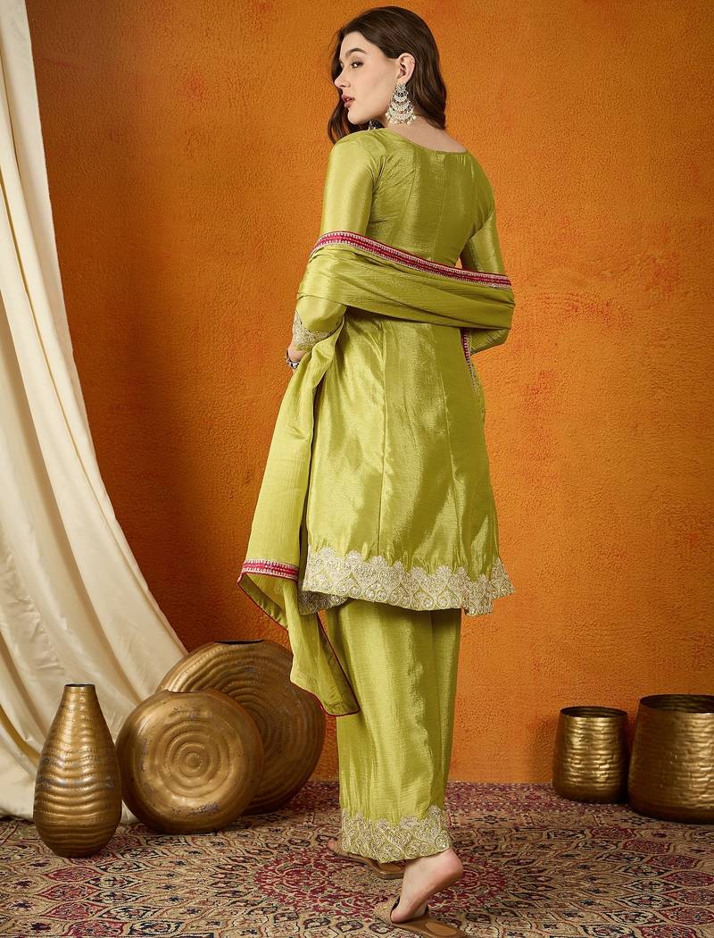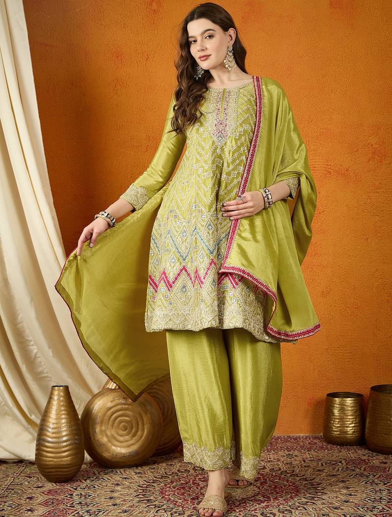 Mehendi chinon embroidered a-line kurta with bottom & chinon dupatta stitched