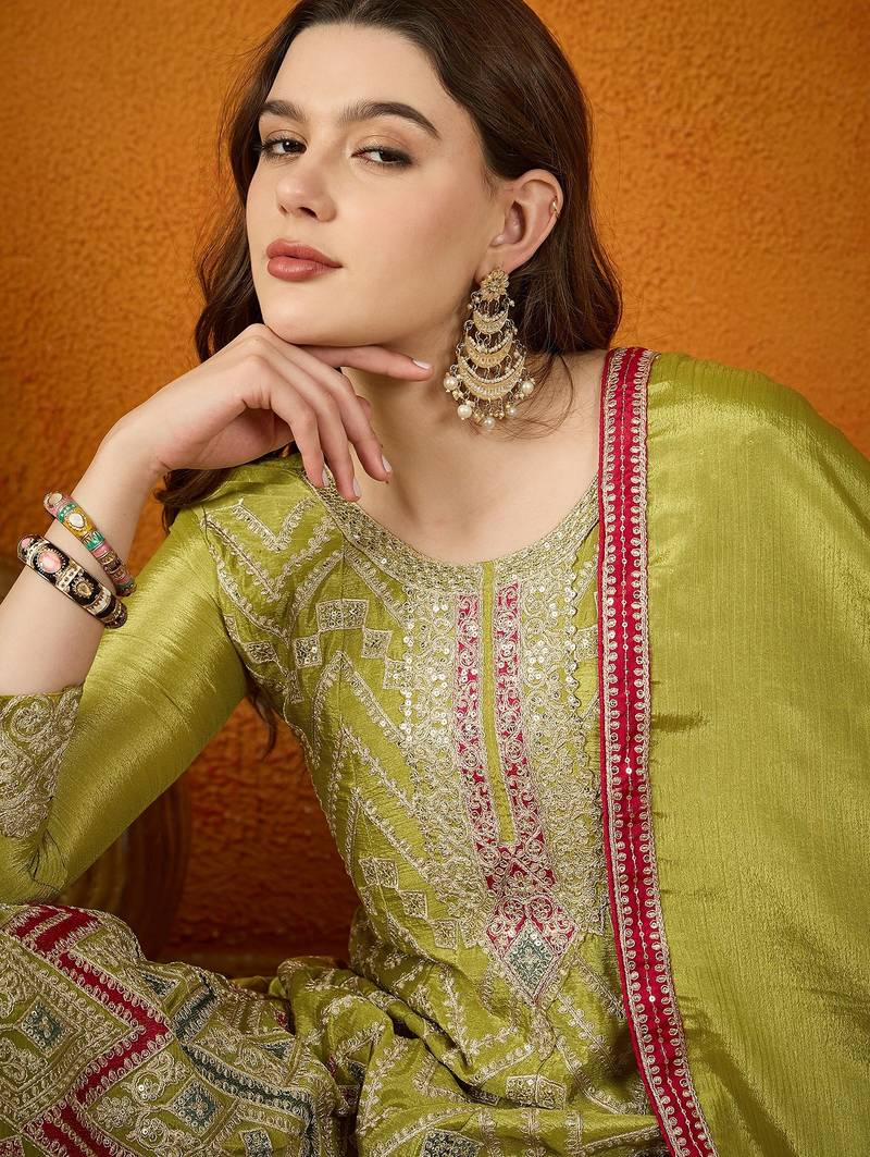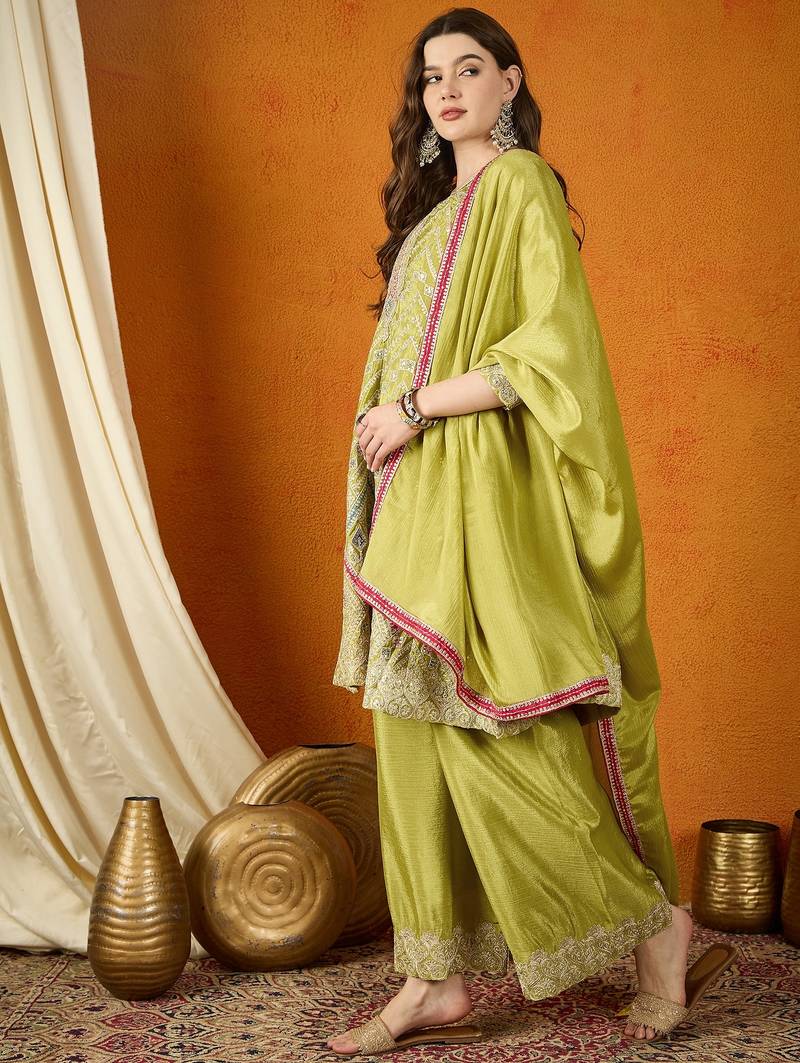 | Product Description | Elegant Mehendi A Line Kurta Crafted From Premium Chinon Fabric. Embroidered Detailing Adds A Festive And Stylish Touch. Stitched Palazzo With Santoon Inner Ensures Comfortable Movement. Lace Work Chinon Dupatta Enhances The Overall Graceful Look. Perfect For Festive Events, Family Gatherings, And Celebrations. |