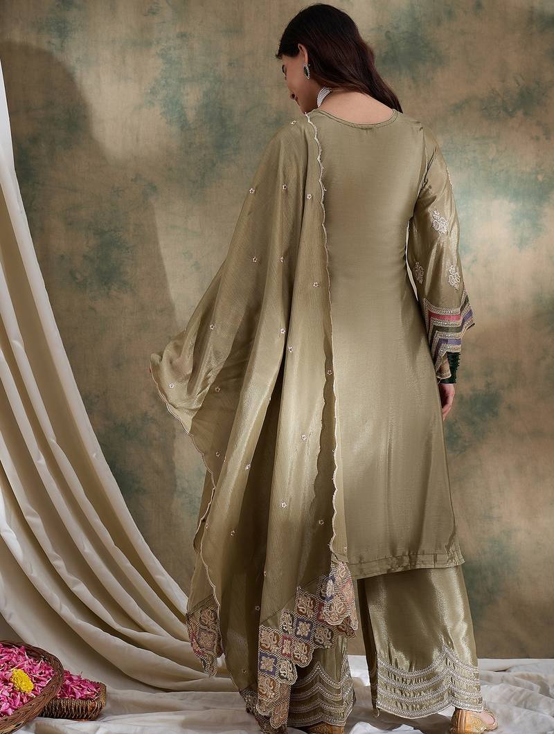 | Product Description | Elegant Mehendi Straight Kurta Made From Premium Chinon Fabric. Embroidered Detailing Enhances The Festive Appeal. Stitched Pants With Santoon Inner Provide Comfortable Wear. Matching Embroidered Chinon Dupatta Completes The Set. Perfect For Festivals, Family Events, And Traditional Functions |