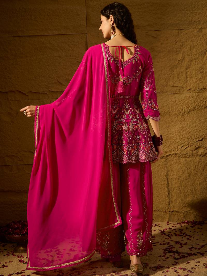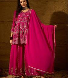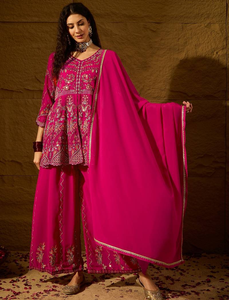 | Product Name | Pink Faux Georgette Top With Bottom And Dupatta 3/4 Sleeve Embroidered Flared Kurta | |